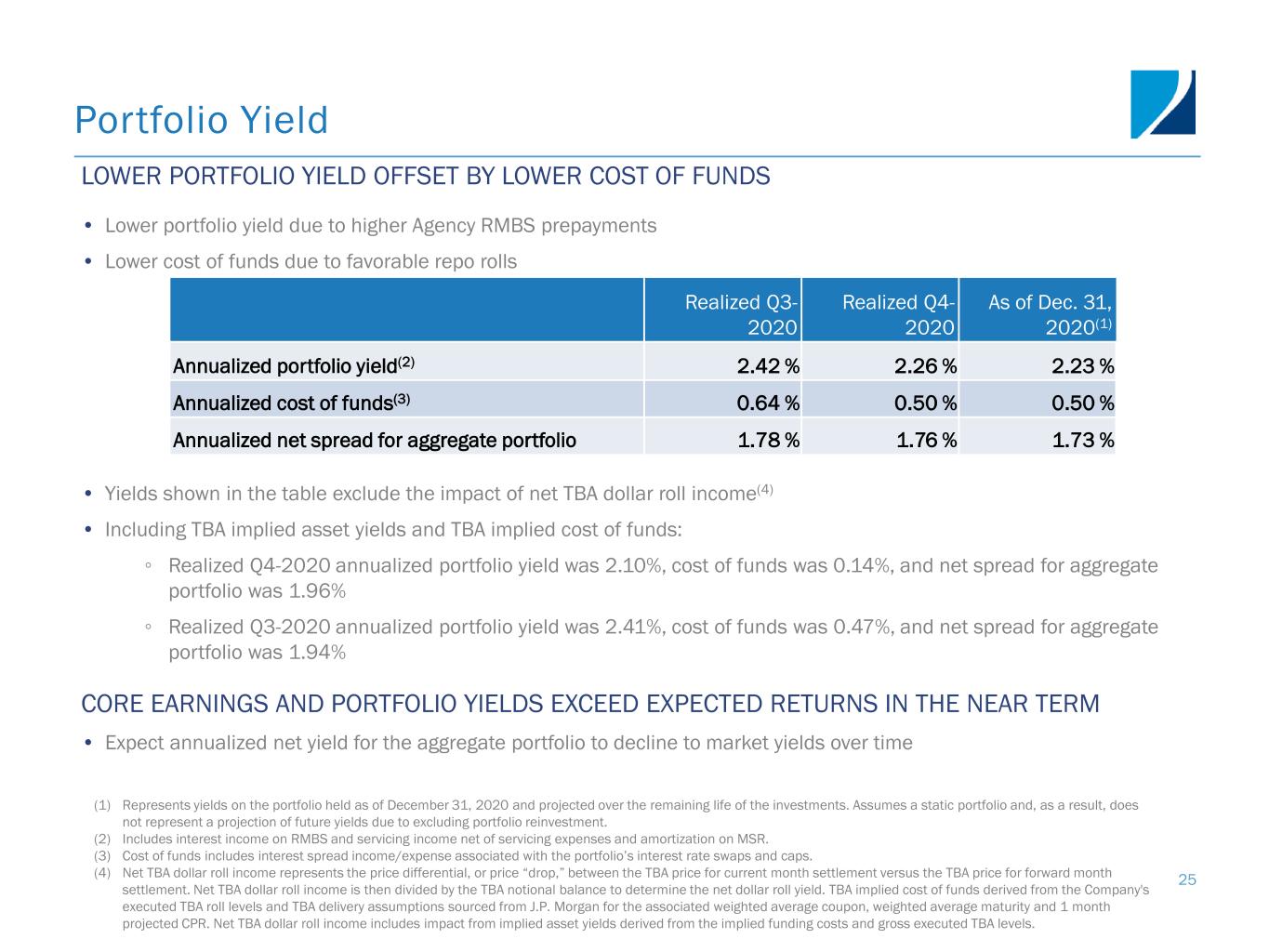 24(1) Core Earnings is a non-GAAP measure. Please see Appendix slide 26 for a definition of Core Earnings and a reconciliation of GAAP to non-GAAP financial information. • Fourth quarter Core Earnings results impacted by: ◦ Interest income decreased from $89.7 million to $72.5 million due to lower average balance and coupon and higher Agency amortization due to prepays ◦ Interest expense decreased from $29.2 million to $22.6 million due to lower borrowing rates and lower average balance ◦ Gain on other derivatives increased from $32.9 million to $43.5 million due to higher TBA dollar roll income driven by higher average balance and continued roll specialness. Roll specialness contributed $0.06 to Core Earnings per weighted average basic common share in the fourth quarter compared to $0.04 in the third quarter ◦ Expenses were favorable by $6.2 million primarily due to transition to self- management and lower servicing costs Core Earnings Review(1) ($ in millions, except per share data) Q3-2020 Q4-2020 Variance ($) Interest income 89.7 72.5 $ (17.2) Interest expense 29.2 22.6 6.6 Net interest income 60.5 49.9 (10.6) Servicing income, net of amortization on MSR 42.2 41.1 (1.1) Gain on swaps and swaptions 0.8 2.0 1.2 Gain on other derivatives 32.9 43.5 10.6 Other 0.1 0.1 — Total other income 76.0 86.7 10.7 Expenses 43.5 37.3 6.2 Benefit from income taxes (1.5) (1.7) 0.2 Core Earnings(1) 94.5 101.0 6.5 Dividends on preferred stock 18.9 19.0 (0.1) Core Earnings attributable to common stockholders(1) $ 75.6 $ 82.0 $ 6.4 Basic weighted average Core EPS $ 0.28 $ 0.30 Core Earnings annualized return on average common equity 15.7% 15.9 %