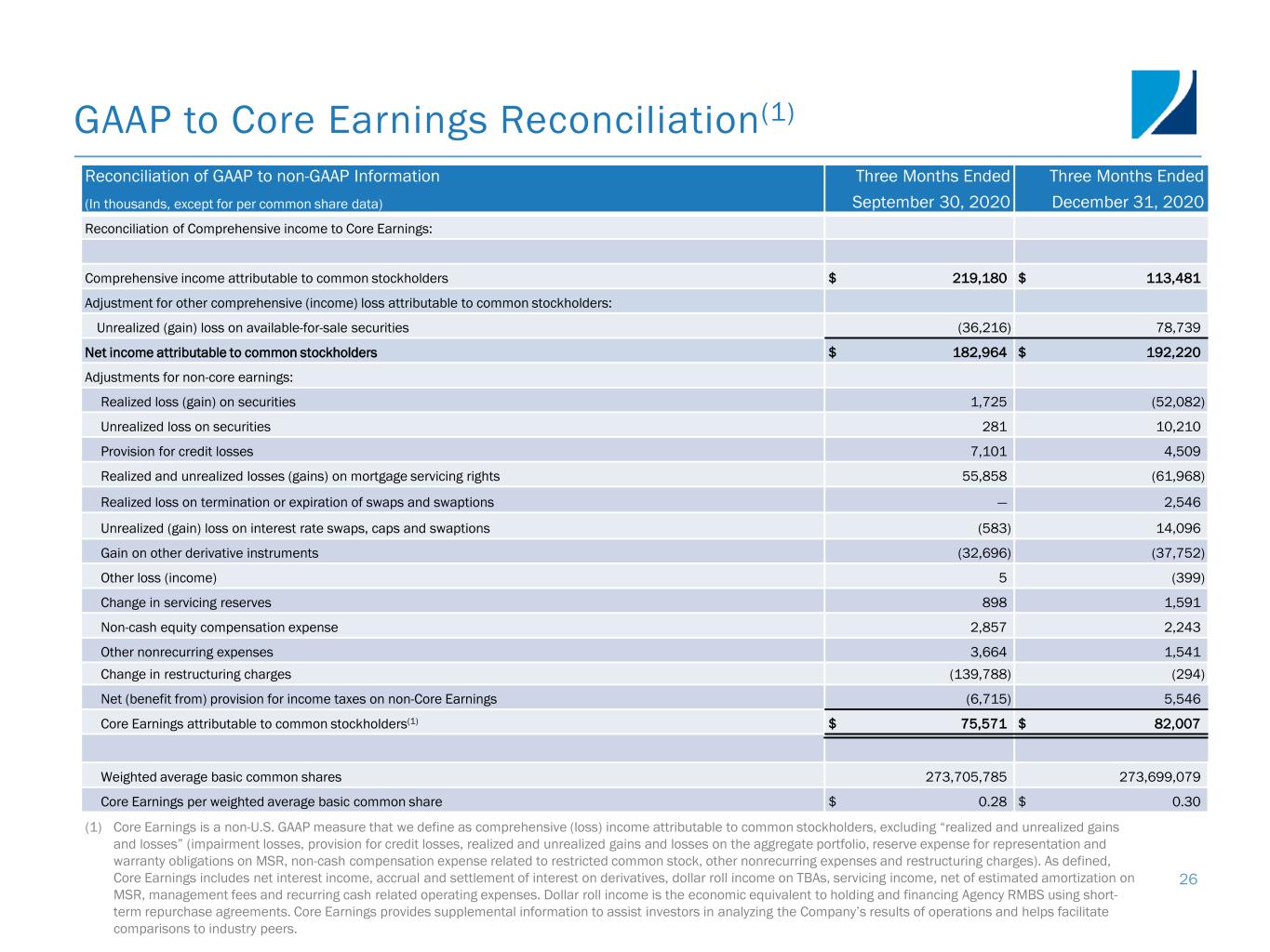 Reconciliation of GAAP to non-GAAP Information Three Months Ended Three Months Ended (In thousands, except for per common share data) September 30, 2020 December 31, 2020 Reconciliation of Comprehensive income to Core Earnings: Comprehensive income attributable to common stockholders $ 219,180 $ 113,481 Adjustment for other comprehensive (income) loss attributable to common stockholders: Unrealized (gain) loss on available-for-sale securities (36,216) 78,739 Net income attributable to common stockholders $ 182,964 $ 192,220 Adjustments for non-core earnings: Realized loss (gain) on securities 1,725 (52,082) Unrealized loss on securities 281 10,210 Provision for credit losses 7,101 4,509 Realized and unrealized losses (gains) on mortgage servicing rights 55,858 (61,968) Realized loss on termination or expiration of swaps and swaptions — 2,546 Unrealized (gain) loss on interest rate swaps, caps and swaptions (583) 14,096 Gain on other derivative instruments (32,696) (37,752) Other loss (income) 5 (399) Change in servicing reserves 898 1,591 Non-cash equity compensation expense 2,857 2,243 Other nonrecurring expenses 3,664 1,541 Change in restructuring charges (139,788) (294) Net (benefit from) provision for income taxes on non-Core Earnings (6,715) 5,546 Core Earnings attributable to common stockholders(1) $ 75,571 $ 82,007 Weighted average basic common shares 273,705,785 273,699,079 Core Earnings per weighted average basic common share $ 0.28 $ 0.30 26 (1) Core Earnings is a non-U.S. GAAP measure that we define as comprehensive (loss) income attributable to common stockholders, excluding “realized and unrealized gains and losses” (impairment losses, provision for credit losses, realized and unrealized gains and losses on the aggregate portfolio, reserve expense for representation and warranty obligations on MSR, non-cash compensation expense related to restricted common stock, other nonrecurring expenses and restructuring charges). As defined, Core Earnings includes net interest income, accrual and settlement of interest on derivatives, dollar roll income on TBAs, servicing income, net of estimated amortization on MSR, management fees and recurring cash related operating expenses. Dollar roll income is the economic equivalent to holding and financing Agency RMBS using short- term repurchase agreements. Core Earnings provides supplemental information to assist investors in analyzing the Company’s results of operations and helps facilitate comparisons to industry peers. GAAP to Core Earnings Reconciliation(1)