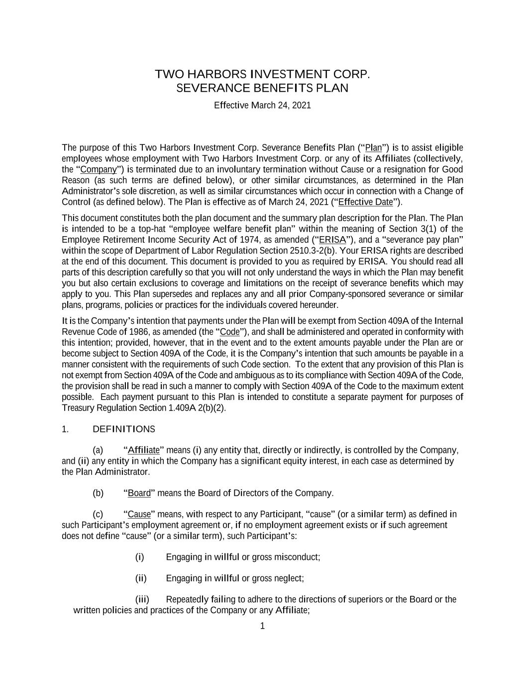 1 TWO HARBORS INVESTMENT CORP. SEVERANCE BENEFITS PLAN Effective March 24, 2021 The purpose of this Two Harbors Investment Corp. Severance Benefits Plan (“Plan”) is to assist eligible employees whose employment with Two Harbors Investment Corp. or any of its Affiliates (collectively, the “Company”) is terminated due to an involuntary termination without Cause or a resignation for Good Reason (as such terms are defined below), or other similar circumstances, as determined in the Plan Administrator’s sole discretion, as well as similar circumstances which occur in connection with a Change of Control (as defined below). The Plan is effective as of March 24, 2021 (“Effective Date”). This document constitutes both the plan document and the summary plan description for the Plan. The Plan is intended to be a top-hat “employee welfare benefit plan” within the meaning of Section 3(1) of the Employee Retirement Income Security Act of 1974, as amended (“ERISA”), and a “severance pay plan” within the scope of Department of Labor Regulation Section 2510.3-2(b). Your ERISA rights are described at the end of this document. This document is provided to you as required by ERISA. You should read all parts of this description carefully so that you will not only understand the ways in which the Plan may benefit you but also certain exclusions to coverage and limitations on the receipt of severance benefits which may apply to you. This Plan supersedes and replaces any and all prior Company-sponsored severance or similar plans, programs, policies or practices for the individuals covered hereunder. It is the Company’s intention that payments under the Plan will be exempt from Section 409A of the Internal Revenue Code of 1986, as amended (the “Code”), and shall be administered and operated in conformity with this intention; provided, however, that in the event and to the extent amounts payable under the Plan are or become subject to Section 409A of the Code, it is the Company’s intention that such amounts be payable in a manner consistent with the requirements of such Code section. To the extent that any provision of this Plan is not exempt from Section 409A of the Code and ambiguous as to its compliance with Section 409A of the Code, the provision shall be read in such a manner to comply with Section 409A of the Code to the maximum extent possible. Each payment pursuant to this Plan is intended to constitute a separate payment for purposes of Treasury Regulation Section 1.409A 2(b)(2). 1. DEFINITIONS (a) “Affiliate” means (i) any entity that, directly or indirectly, is controlled by the Company, and (ii) any entity in which the Company has a significant equity interest, in each case as determined by the Plan Administrator. (b) “Board” means the Board of Directors of the Company. (c) “Cause” means, with respect to any Participant, “cause” (or a similar term) as defined in such Participant’s employment agreement or, if no employment agreement exists or if such agreement does not define “cause” (or a similar term), such Participant’s: (i) Engaging in willful or gross misconduct; (ii) Engaging in willful or gross neglect; (iii) Repeatedly failing to adhere to the directions of superiors or the Board or the written policies and practices of the Company or any Affiliate;