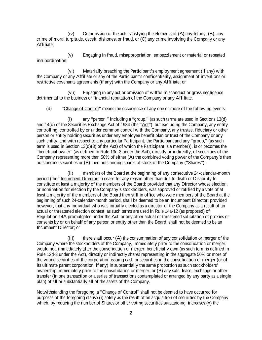 2 (iv) Commission of the acts satisfying the elements of (A) any felony, (B), any crime of moral turpitude, deceit, dishonest or fraud, or (C) any crime involving the Company or any Affiliate; (v) Engaging in fraud, misappropriation, embezzlement or material or repeated insubordination; (vi) Materially breaching the Participant’s employment agreement (if any) with the Company or any Affiliate or any of the Participant’s confidentiality, assignment of inventions or restrictive covenants agreements (if any) with the Company or any Affiliate; or (vii) Engaging in any act or omission of willful misconduct or gross negligence detrimental to the business or financial reputation of the Company or any Affiliate. (d) “Change of Control” means the occurrence of any one or more of the following events: (i) any “person,” including a “group,” (as such terms are used in Sections 13(d) and 14(d) of the Securities Exchange Act of 1934 (the “Act”), but excluding the Company, any entity controlling, controlled by or under common control with the Company, any trustee, fiduciary or other person or entity holding securities under any employee benefit plan or trust of the Company or any such entity, and with respect to any particular Participant, the Participant and any “group,” (as such term is used in Section 13(d)(3) of the Act) of which the Participant is a member)), is or becomes the “beneficial owner” (as defined in Rule 13d-3 under the Act), directly or indirectly, of securities of the Company representing more than 50% of either (A) the combined voting power of the Company’s then outstanding securities or (B) then outstanding shares of stock of the Company (“Shares”); (ii) members of the Board at the beginning of any consecutive 24-calendar-month period (the “Incumbent Directors”) cease for any reason other than due to death or Disability to constitute at least a majority of the members of the Board; provided that any Director whose election, or nomination for election by the Company’s stockholders, was approved or ratified by a vote of at least a majority of the members of the Board then still in office who were members of the Board at the beginning of such 24-calendar-month period, shall be deemed to be an Incumbent Director; provided however, that any individual who was initially elected as a director of the Company as a result of an actual or threatened election contest, as such terms are used in Rule 14a-12 (as proposed) of Regulation 14A promulgated under the Act, or any other actual or threatened solicitation of proxies or consents by or on behalf of any person or entity other than the Board, shall not be deemed to be an Incumbent Director; or (iii) there shall occur (A) the consummation of any consolidation or merger of the Company where the stockholders of the Company, immediately prior to the consolidation or merger, would not, immediately after the consolidation or merger, beneficially own (as such term is defined in Rule 12d-3 under the Act), directly or indirectly shares representing in the aggregate 50% or more of the voting securities of the corporation issuing cash or securities in the consolidation or merger (or of its ultimate parent corporation, if any) in substantially the same proportion as such stockholders’ ownership immediately prior to the consolidation or merger, or (B) any sale, lease, exchange or other transfer (in one transaction or a series of transactions contemplated or arranged by any party as a single plan) of all or substantially all of the assets of the Company. Notwithstanding the foregoing, a “Change of Control” shall not be deemed to have occurred for purposes of the foregoing clause (i) solely as the result of an acquisition of securities by the Company which, by reducing the number of Shares or other voting securities outstanding, increases (x) the