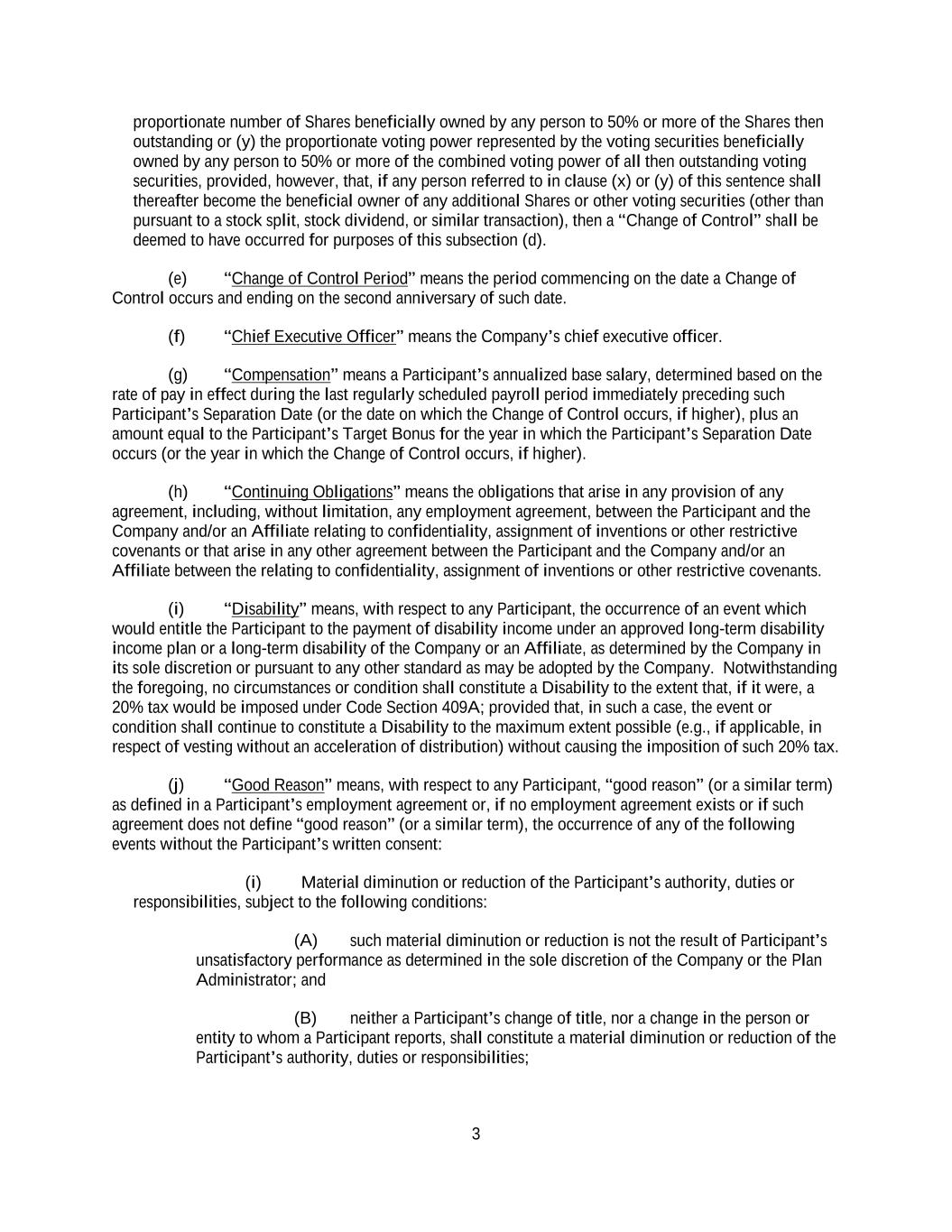 3 proportionate number of Shares beneficially owned by any person to 50% or more of the Shares then outstanding or (y) the proportionate voting power represented by the voting securities beneficially owned by any person to 50% or more of the combined voting power of all then outstanding voting securities, provided, however, that, if any person referred to in clause (x) or (y) of this sentence shall thereafter become the beneficial owner of any additional Shares or other voting securities (other than pursuant to a stock split, stock dividend, or similar transaction), then a “Change of Control” shall be deemed to have occurred for purposes of this subsection (d). (e) “Change of Control Period” means the period commencing on the date a Change of Control occurs and ending on the second anniversary of such date. (f) “Chief Executive Officer” means the Company’s chief executive officer. (g) “Compensation” means a Participant’s annualized base salary, determined based on the rate of pay in effect during the last regularly scheduled payroll period immediately preceding such Participant’s Separation Date (or the date on which the Change of Control occurs, if higher), plus an amount equal to the Participant’s Target Bonus for the year in which the Participant’s Separation Date occurs (or the year in which the Change of Control occurs, if higher). (h) “Continuing Obligations” means the obligations that arise in any provision of any agreement, including, without limitation, any employment agreement, between the Participant and the Company and/or an Affiliate relating to confidentiality, assignment of inventions or other restrictive covenants or that arise in any other agreement between the Participant and the Company and/or an Affiliate between the relating to confidentiality, assignment of inventions or other restrictive covenants. (i) “Disability” means, with respect to any Participant, the occurrence of an event which would entitle the Participant to the payment of disability income under an approved long-term disability income plan or a long-term disability of the Company or an Affiliate, as determined by the Company in its sole discretion or pursuant to any other standard as may be adopted by the Company. Notwithstanding the foregoing, no circumstances or condition shall constitute a Disability to the extent that, if it were, a 20% tax would be imposed under Code Section 409A; provided that, in such a case, the event or condition shall continue to constitute a Disability to the maximum extent possible (e.g., if applicable, in respect of vesting without an acceleration of distribution) without causing the imposition of such 20% tax. (j) “Good Reason” means, with respect to any Participant, “good reason” (or a similar term) as defined in a Participant’s employment agreement or, if no employment agreement exists or if such agreement does not define “good reason” (or a similar term), the occurrence of any of the following events without the Participant’s written consent: (i) Material diminution or reduction of the Participant’s authority, duties or responsibilities, subject to the following conditions: (A) such material diminution or reduction is not the result of Participant’s unsatisfactory performance as determined in the sole discretion of the Company or the Plan Administrator; and (B) neither a Participant’s change of title, nor a change in the person or entity to whom a Participant reports, shall constitute a material diminution or reduction of the Participant’s authority, duties or responsibilities;
