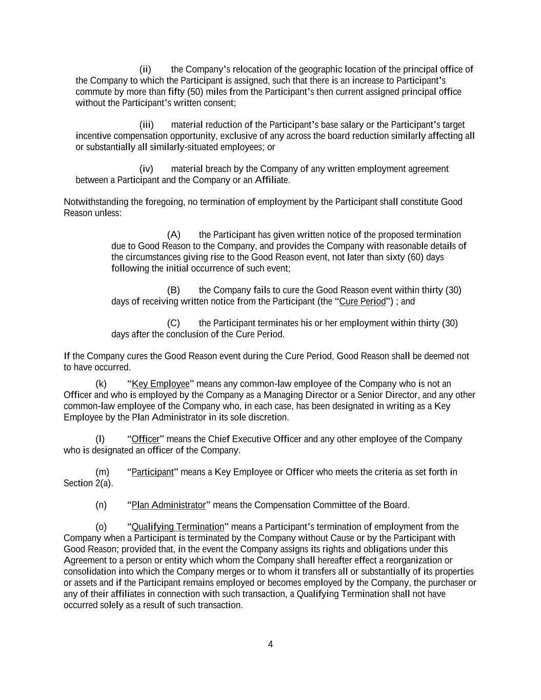 4 (ii) the Company’s relocation of the geographic location of the principal office of the Company to which the Participant is assigned, such that there is an increase to Participant’s commute by more than fifty (50) miles from the Participant’s then current assigned principal office without the Participant’s written consent; (iii) material reduction of the Participant’s base salary or the Participant’s target incentive compensation opportunity, exclusive of any across the board reduction similarly affecting all or substantially all similarly-situated employees; or (iv) material breach by the Company of any written employment agreement between a Participant and the Company or an Affiliate. Notwithstanding the foregoing, no termination of employment by the Participant shall constitute Good Reason unless: (A) the Participant has given written notice of the proposed termination due to Good Reason to the Company, and provides the Company with reasonable details of the circumstances giving rise to the Good Reason event, not later than sixty (60) days following the initial occurrence of such event; (B) the Company fails to cure the Good Reason event within thirty (30) days of receiving written notice from the Participant (the “Cure Period”) ; and (C) the Participant terminates his or her employment within thirty (30) days after the conclusion of the Cure Period. If the Company cures the Good Reason event during the Cure Period, Good Reason shall be deemed not to have occurred. (k) “Key Employee” means any common-law employee of the Company who is not an Officer and who is employed by the Company as a Managing Director or a Senior Director, and any other common-law employee of the Company who, in each case, has been designated in writing as a Key Employee by the Plan Administrator in its sole discretion. (l) “Officer” means the Chief Executive Officer and any other employee of the Company who is designated an officer of the Company. (m) “Participant” means a Key Employee or Officer who meets the criteria as set forth in Section 2(a). (n) “Plan Administrator” means the Compensation Committee of the Board. (o) “Qualifying Termination” means a Participant’s termination of employment from the Company when a Participant is terminated by the Company without Cause or by the Participant with Good Reason; provided that, in the event the Company assigns its rights and obligations under this Agreement to a person or entity which whom the Company shall hereafter effect a reorganization or consolidation into which the Company merges or to whom it transfers all or substantially of its properties or assets and if the Participant remains employed or becomes employed by the Company, the purchaser or any of their affiliates in connection with such transaction, a Qualifying Termination shall not have occurred solely as a result of such transaction.