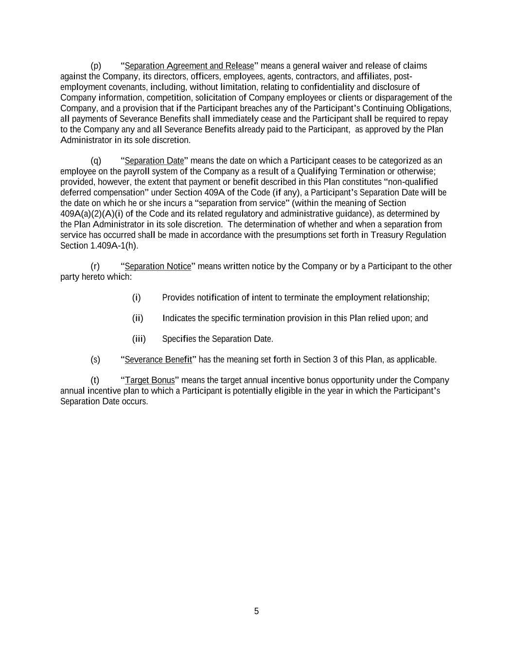 5 (p) “Separation Agreement and Release” means a general waiver and release of claims against the Company, its directors, officers, employees, agents, contractors, and affiliates, post- employment covenants, including, without limitation, relating to confidentiality and disclosure of Company information, competition, solicitation of Company employees or clients or disparagement of the Company, and a provision that if the Participant breaches any of the Participant’s Continuing Obligations, all payments of Severance Benefits shall immediately cease and the Participant shall be required to repay to the Company any and all Severance Benefits already paid to the Participant, as approved by the Plan Administrator in its sole discretion. (q) “Separation Date” means the date on which a Participant ceases to be categorized as an employee on the payroll system of the Company as a result of a Qualifying Termination or otherwise; provided, however, the extent that payment or benefit described in this Plan constitutes “non-qualified deferred compensation” under Section 409A of the Code (if any), a Participant’s Separation Date will be the date on which he or she incurs a “separation from service” (within the meaning of Section 409A(a)(2)(A)(i) of the Code and its related regulatory and administrative guidance), as determined by the Plan Administrator in its sole discretion. The determination of whether and when a separation from service has occurred shall be made in accordance with the presumptions set forth in Treasury Regulation Section 1.409A-1(h). (r) “Separation Notice” means written notice by the Company or by a Participant to the other party hereto which: (i) Provides notification of intent to terminate the employment relationship; (ii) Indicates the specific termination provision in this Plan relied upon; and (iii) Specifies the Separation Date. (s) “Severance Benefit” has the meaning set forth in Section 3 of this Plan, as applicable. (t) “Target Bonus” means the target annual incentive bonus opportunity under the Company annual incentive plan to which a Participant is potentially eligible in the year in which the Participant’s Separation Date occurs.