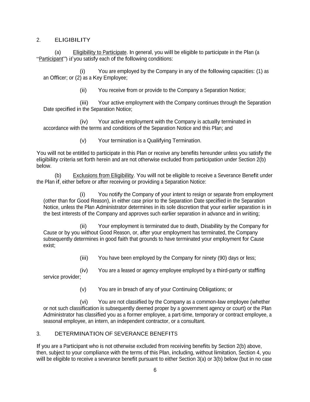 6 2. ELIGIBILITY (a) Eligibility to Participate. In general, you will be eligible to participate in the Plan (a “Participant”) if you satisfy each of the following conditions: (i) You are employed by the Company in any of the following capacities: (1) as an Officer; or (2) as a Key Employee; (ii) You receive from or provide to the Company a Separation Notice; (iii) Your active employment with the Company continues through the Separation Date specified in the Separation Notice; (iv) Your active employment with the Company is actually terminated in accordance with the terms and conditions of the Separation Notice and this Plan; and (v) Your termination is a Qualifying Termination. You will not be entitled to participate in this Plan or receive any benefits hereunder unless you satisfy the eligibility criteria set forth herein and are not otherwise excluded from participation under Section 2(b) below. (b) Exclusions from Eligibility. You will not be eligible to receive a Severance Benefit under the Plan if, either before or after receiving or providing a Separation Notice: (i) You notify the Company of your intent to resign or separate from employment (other than for Good Reason), in either case prior to the Separation Date specified in the Separation Notice, unless the Plan Administrator determines in its sole discretion that your earlier separation is in the best interests of the Company and approves such earlier separation in advance and in writing; (ii) Your employment is terminated due to death, Disability by the Company for Cause or by you without Good Reason, or, after your employment has terminated, the Company subsequently determines in good faith that grounds to have terminated your employment for Cause exist; (iii) You have been employed by the Company for ninety (90) days or less; (iv) You are a leased or agency employee employed by a third-party or staffing service provider; (v) You are in breach of any of your Continuing Obligations; or (vi) You are not classified by the Company as a common-law employee (whether or not such classification is subsequently deemed proper by a government agency or court) or the Plan Administrator has classified you as a former employee, a part-time, temporary or contract employee, a seasonal employee, an intern, an independent contractor, or a consultant. 3. DETERMINATION OF SEVERANCE BENEFITS If you are a Participant who is not otherwise excluded from receiving benefits by Section 2(b) above, then, subject to your compliance with the terms of this Plan, including, without limitation, Section 4, you will be eligible to receive a severance benefit pursuant to either Section 3(a) or 3(b) below (but in no case