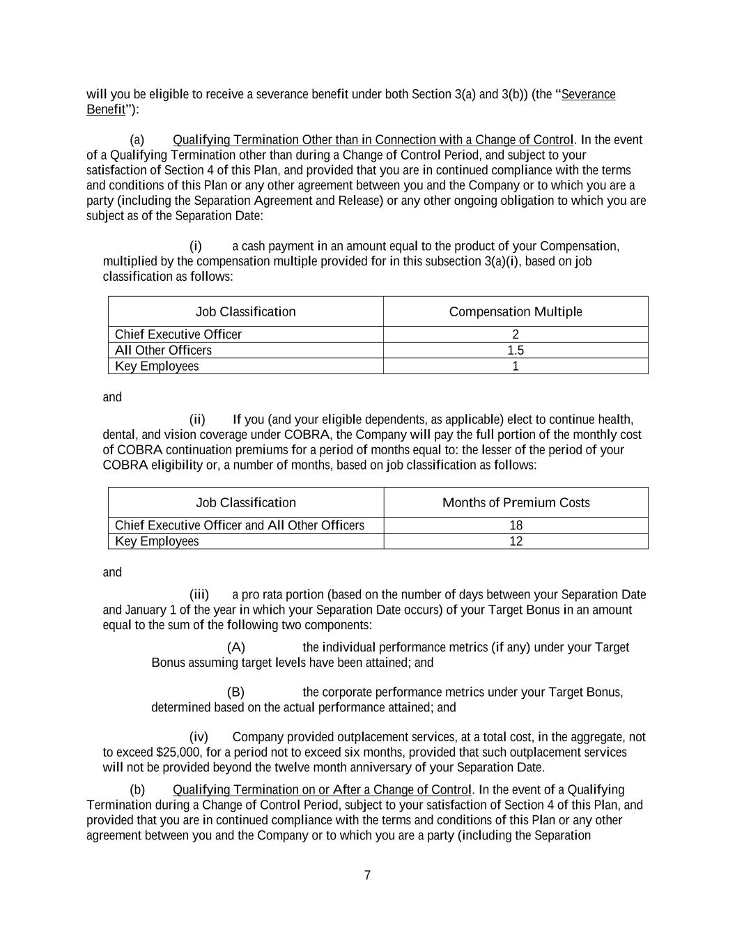 7 will you be eligible to receive a severance benefit under both Section 3(a) and 3(b)) (the “Severance Benefit”): (a) Qualifying Termination Other than in Connection with a Change of Control. In the event of a Qualifying Termination other than during a Change of Control Period, and subject to your satisfaction of Section 4 of this Plan, and provided that you are in continued compliance with the terms and conditions of this Plan or any other agreement between you and the Company or to which you are a party (including the Separation Agreement and Release) or any other ongoing obligation to which you are subject as of the Separation Date: (i) a cash payment in an amount equal to the product of your Compensation, multiplied by the compensation multiple provided for in this subsection 3(a)(i), based on job classification as follows: Job Classification Compensation Multiple Chief Executive Officer 2 All Other Officers 1.5 Key Employees 1 and (ii) If you (and your eligible dependents, as applicable) elect to continue health, dental, and vision coverage under COBRA, the Company will pay the full portion of the monthly cost of COBRA continuation premiums for a period of months equal to: the lesser of the period of your COBRA eligibility or, a number of months, based on job classification as follows: Job Classification Months of Premium Costs Chief Executive Officer and All Other Officers 18 Key Employees 12 and (iii) a pro rata portion (based on the number of days between your Separation Date and January 1 of the year in which your Separation Date occurs) of your Target Bonus in an amount equal to the sum of the following two components: (A) the individual performance metrics (if any) under your Target Bonus assuming target levels have been attained; and (B) the corporate performance metrics under your Target Bonus, determined based on the actual performance attained; and (iv) Company provided outplacement services, at a total cost, in the aggregate, not to exceed $25,000, for a period not to exceed six months, provided that such outplacement services will not be provided beyond the twelve month anniversary of your Separation Date. (b) Qualifying Termination on or After a Change of Control. In the event of a Qualifying Termination during a Change of Control Period, subject to your satisfaction of Section 4 of this Plan, and provided that you are in continued compliance with the terms and conditions of this Plan or any other agreement between you and the Company or to which you are a party (including the Separation