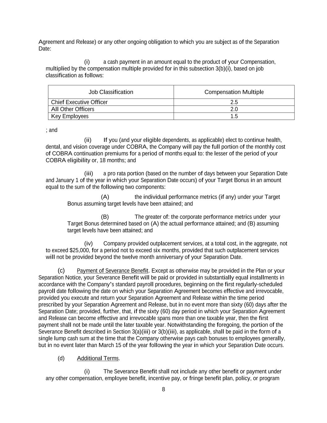 8 Agreement and Release) or any other ongoing obligation to which you are subject as of the Separation Date: (i) a cash payment in an amount equal to the product of your Compensation, multiplied by the compensation multiple provided for in this subsection 3(b)(i), based on job classification as follows: Job Classification Compensation Multiple Chief Executive Officer 2.5 All Other Officers 2.0 Key Employees 1.5 ; and (ii) If you (and your eligible dependents, as applicable) elect to continue health, dental, and vision coverage under COBRA, the Company will pay the full portion of the monthly cost of COBRA continuation premiums for a period of months equal to: the lesser of the period of your COBRA eligibility or, 18 months; and (iii) a pro rata portion (based on the number of days between your Separation Date and January 1 of the year in which your Separation Date occurs) of your Target Bonus in an amount equal to the sum of the following two components: (A) the individual performance metrics (if any) under your Target Bonus assuming target levels have been attained; and (B) The greater of: the corporate performance metrics under your Target Bonus determined based on (A) the actual performance attained; and (B) assuming target levels have been attained; and (iv) Company provided outplacement services, at a total cost, in the aggregate, not to exceed $25,000, for a period not to exceed six months, provided that such outplacement services will not be provided beyond the twelve month anniversary of your Separation Date. (c) Payment of Severance Benefit. Except as otherwise may be provided in the Plan or your Separation Notice, your Severance Benefit will be paid or provided in substantially equal installments in accordance with the Company’s standard payroll procedures, beginning on the first regularly-scheduled payroll date following the date on which your Separation Agreement becomes effective and irrevocable, provided you execute and return your Separation Agreement and Release within the time period prescribed by your Separation Agreement and Release, but in no event more than sixty (60) days after the Separation Date; provided, further, that, if the sixty (60) day period in which your Separation Agreement and Release can become effective and irrevocable spans more than one taxable year, then the first payment shall not be made until the later taxable year. Notwithstanding the foregoing, the portion of the Severance Benefit described in Section 3(a)(iii) or 3(b)(iii), as applicable, shall be paid in the form of a single lump cash sum at the time that the Company otherwise pays cash bonuses to employees generally, but in no event later than March 15 of the year following the year in which your Separation Date occurs. (d) Additional Terms. (i) The Severance Benefit shall not include any other benefit or payment under any other compensation, employee benefit, incentive pay, or fringe benefit plan, policy, or program