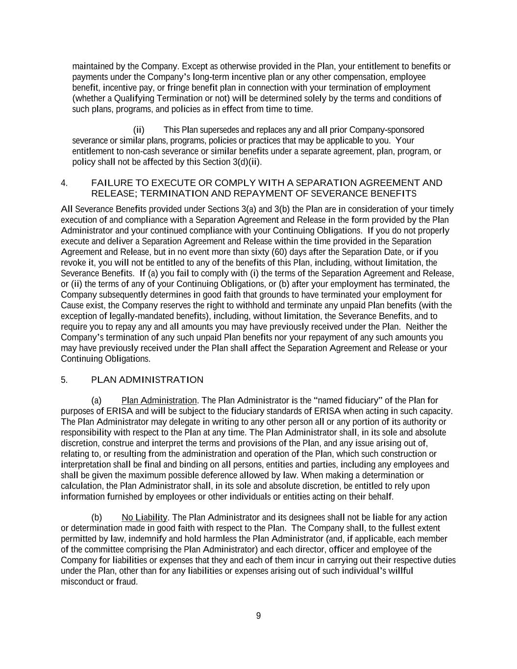 9 maintained by the Company. Except as otherwise provided in the Plan, your entitlement to benefits or payments under the Company’s long-term incentive plan or any other compensation, employee benefit, incentive pay, or fringe benefit plan in connection with your termination of employment (whether a Qualifying Termination or not) will be determined solely by the terms and conditions of such plans, programs, and policies as in effect from time to time. (ii) This Plan supersedes and replaces any and all prior Company-sponsored severance or similar plans, programs, policies or practices that may be applicable to you. Your entitlement to non-cash severance or similar benefits under a separate agreement, plan, program, or policy shall not be affected by this Section 3(d)(ii). 4. FAILURE TO EXECUTE OR COMPLY WITH A SEPARATION AGREEMENT AND RELEASE; TERMINATION AND REPAYMENT OF SEVERANCE BENEFITS All Severance Benefits provided under Sections 3(a) and 3(b) the Plan are in consideration of your timely execution of and compliance with a Separation Agreement and Release in the form provided by the Plan Administrator and your continued compliance with your Continuing Obligations. If you do not properly execute and deliver a Separation Agreement and Release within the time provided in the Separation Agreement and Release, but in no event more than sixty (60) days after the Separation Date, or if you revoke it, you will not be entitled to any of the benefits of this Plan, including, without limitation, the Severance Benefits. If (a) you fail to comply with (i) the terms of the Separation Agreement and Release, or (ii) the terms of any of your Continuing Obligations, or (b) after your employment has terminated, the Company subsequently determines in good faith that grounds to have terminated your employment for Cause exist, the Company reserves the right to withhold and terminate any unpaid Plan benefits (with the exception of legally-mandated benefits), including, without limitation, the Severance Benefits, and to require you to repay any and all amounts you may have previously received under the Plan. Neither the Company’s termination of any such unpaid Plan benefits nor your repayment of any such amounts you may have previously received under the Plan shall affect the Separation Agreement and Release or your Continuing Obligations. 5. PLAN ADMINISTRATION (a) Plan Administration. The Plan Administrator is the “named fiduciary” of the Plan for purposes of ERISA and will be subject to the fiduciary standards of ERISA when acting in such capacity. The Plan Administrator may delegate in writing to any other person all or any portion of its authority or responsibility with respect to the Plan at any time. The Plan Administrator shall, in its sole and absolute discretion, construe and interpret the terms and provisions of the Plan, and any issue arising out of, relating to, or resulting from the administration and operation of the Plan, which such construction or interpretation shall be final and binding on all persons, entities and parties, including any employees and shall be given the maximum possible deference allowed by law. When making a determination or calculation, the Plan Administrator shall, in its sole and absolute discretion, be entitled to rely upon information furnished by employees or other individuals or entities acting on their behalf. (b) No Liability. The Plan Administrator and its designees shall not be liable for any action or determination made in good faith with respect to the Plan. The Company shall, to the fullest extent permitted by law, indemnify and hold harmless the Plan Administrator (and, if applicable, each member of the committee comprising the Plan Administrator) and each director, officer and employee of the Company for liabilities or expenses that they and each of them incur in carrying out their respective duties under the Plan, other than for any liabilities or expenses arising out of such individual’s willful misconduct or fraud.