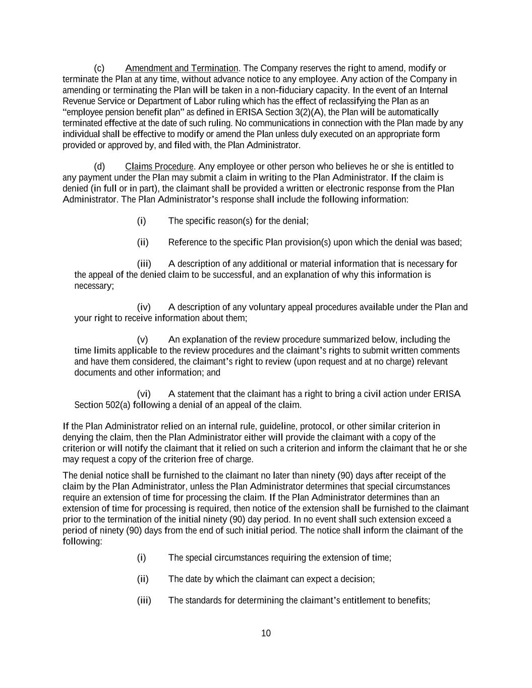 10 (c) Amendment and Termination. The Company reserves the right to amend, modify or terminate the Plan at any time, without advance notice to any employee. Any action of the Company in amending or terminating the Plan will be taken in a non-fiduciary capacity. In the event of an Internal Revenue Service or Department of Labor ruling which has the effect of reclassifying the Plan as an “employee pension benefit plan” as defined in ERISA Section 3(2)(A), the Plan will be automatically terminated effective at the date of such ruling. No communications in connection with the Plan made by any individual shall be effective to modify or amend the Plan unless duly executed on an appropriate form provided or approved by, and filed with, the Plan Administrator. (d) Claims Procedure. Any employee or other person who believes he or she is entitled to any payment under the Plan may submit a claim in writing to the Plan Administrator. If the claim is denied (in full or in part), the claimant shall be provided a written or electronic response from the Plan Administrator. The Plan Administrator’s response shall include the following information: (i) The specific reason(s) for the denial; (ii) Reference to the specific Plan provision(s) upon which the denial was based; (iii) A description of any additional or material information that is necessary for the appeal of the denied claim to be successful, and an explanation of why this information is necessary; (iv) A description of any voluntary appeal procedures available under the Plan and your right to receive information about them; (v) An explanation of the review procedure summarized below, including the time limits applicable to the review procedures and the claimant’s rights to submit written comments and have them considered, the claimant’s right to review (upon request and at no charge) relevant documents and other information; and (vi) A statement that the claimant has a right to bring a civil action under ERISA Section 502(a) following a denial of an appeal of the claim. If the Plan Administrator relied on an internal rule, guideline, protocol, or other similar criterion in denying the claim, then the Plan Administrator either will provide the claimant with a copy of the criterion or will notify the claimant that it relied on such a criterion and inform the claimant that he or she may request a copy of the criterion free of charge. The denial notice shall be furnished to the claimant no later than ninety (90) days after receipt of the claim by the Plan Administrator, unless the Plan Administrator determines that special circumstances require an extension of time for processing the claim. If the Plan Administrator determines than an extension of time for processing is required, then notice of the extension shall be furnished to the claimant prior to the termination of the initial ninety (90) day period. In no event shall such extension exceed a period of ninety (90) days from the end of such initial period. The notice shall inform the claimant of the following: (i) The special circumstances requiring the extension of time; (ii) The date by which the claimant can expect a decision; (iii) The standards for determining the claimant’s entitlement to benefits;