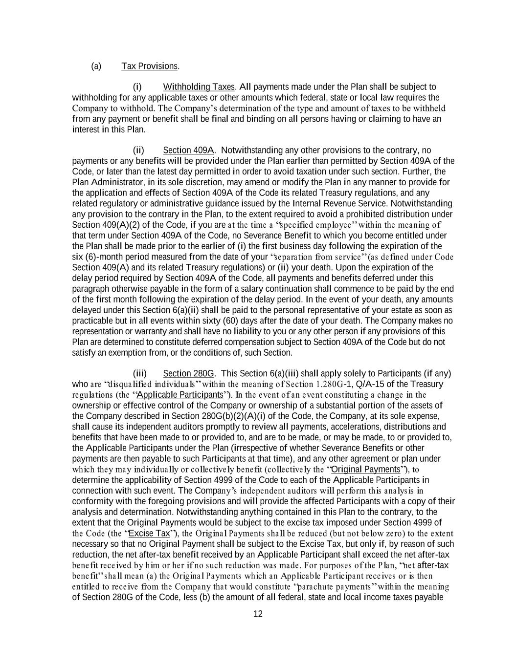 12 (a) Tax Provisions. (i) Withholding Taxes. All payments made under the Plan shall be subject to withholding for any applicable taxes or other amounts which federal, state or local law requires the Company to withhold. The Company’s determination of the type and amount of taxes to be withheld from any payment or benefit shall be final and binding on all persons having or claiming to have an interest in this Plan. (ii) Section 409A. Notwithstanding any other provisions to the contrary, no payments or any benefits will be provided under the Plan earlier than permitted by Section 409A of the Code, or later than the latest day permitted in order to avoid taxation under such section. Further, the Plan Administrator, in its sole discretion, may amend or modify the Plan in any manner to provide for the application and effects of Section 409A of the Code its related Treasury regulations, and any related regulatory or administrative guidance issued by the Internal Revenue Service. Notwithstanding any provision to the contrary in the Plan, to the extent required to avoid a prohibited distribution under Section 409(A)(2) of the Code, if you are at the time a “specified employee” within the meaning of that term under Section 409A of the Code, no Severance Benefit to which you become entitled under the Plan shall be made prior to the earlier of (i) the first business day following the expiration of the six (6)-month period measured from the date of your “separation from service” (as defined under Code Section 409(A) and its related Treasury regulations) or (ii) your death. Upon the expiration of the delay period required by Section 409A of the Code, all payments and benefits deferred under this paragraph otherwise payable in the form of a salary continuation shall commence to be paid by the end of the first month following the expiration of the delay period. In the event of your death, any amounts delayed under this Section 6(a)(ii) shall be paid to the personal representative of your estate as soon as practicable but in all events within sixty (60) days after the date of your death. The Company makes no representation or warranty and shall have no liability to you or any other person if any provisions of this Plan are determined to constitute deferred compensation subject to Section 409A of the Code but do not satisfy an exemption from, or the conditions of, such Section. (iii) Section 280G. This Section 6(a)(iii) shall apply solely to Participants (if any) who are “disqualified individuals” within the meaning of Section 1.280G-1, Q/A-15 of the Treasury regulations (the “Applicable Participants”). In the event of an event constituting a change in the ownership or effective control of the Company or ownership of a substantial portion of the assets of the Company described in Section 280G(b)(2)(A)(i) of the Code, the Company, at its sole expense, shall cause its independent auditors promptly to review all payments, accelerations, distributions and benefits that have been made to or provided to, and are to be made, or may be made, to or provided to, the Applicable Participants under the Plan (irrespective of whether Severance Benefits or other payments are then payable to such Participants at that time), and any other agreement or plan under which they may individually or collectively benefit (collectively the “Original Payments”), to determine the applicability of Section 4999 of the Code to each of the Applicable Participants in connection with such event. The Company’s independent auditors will perform this analysis in conformity with the foregoing provisions and will provide the affected Participants with a copy of their analysis and determination. Notwithstanding anything contained in this Plan to the contrary, to the extent that the Original Payments would be subject to the excise tax imposed under Section 4999 of the Code (the “Excise Tax”), the Original Payments shall be reduced (but not below zero) to the extent necessary so that no Original Payment shall be subject to the Excise Tax, but only if, by reason of such reduction, the net after-tax benefit received by an Applicable Participant shall exceed the net after-tax benefit received by him or her if no such reduction was made. For purposes of the Plan, “net after-tax benefit” shall mean (a) the Original Payments which an Applicable Participant receives or is then entitled to receive from the Company that would constitute “parachute payments” within the meaning of Section 280G of the Code, less (b) the amount of all federal, state and local income taxes payable