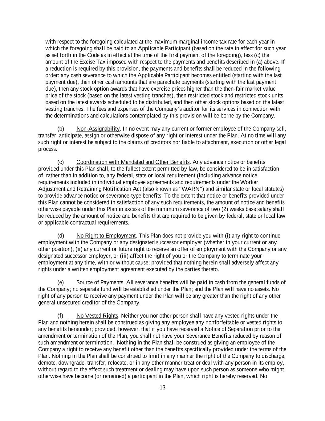 13 with respect to the foregoing calculated at the maximum marginal income tax rate for each year in which the foregoing shall be paid to an Applicable Participant (based on the rate in effect for such year as set forth in the Code as in effect at the time of the first payment of the foregoing), less (c) the amount of the Excise Tax imposed with respect to the payments and benefits described in (a) above. If a reduction is required by this provision, the payments and benefits shall be reduced in the following order: any cash severance to which the Applicable Participant becomes entitled (starting with the last payment due), then other cash amounts that are parachute payments (starting with the last payment due), then any stock option awards that have exercise prices higher than the then-fair market value price of the stock (based on the latest vesting tranches), then restricted stock and restricted stock units based on the latest awards scheduled to be distributed, and then other stock options based on the latest vesting tranches. The fees and expenses of the Company’s auditor for its services in connection with the determinations and calculations contemplated by this provision will be borne by the Company. (b) Non-Assignability. In no event may any current or former employee of the Company sell, transfer, anticipate, assign or otherwise dispose of any right or interest under the Plan. At no time will any such right or interest be subject to the claims of creditors nor liable to attachment, execution or other legal process. (c) Coordination with Mandated and Other Benefits. Any advance notice or benefits provided under this Plan shall, to the fullest extent permitted by law, be considered to be in satisfaction of, rather than in addition to, any federal, state or local requirement (including advance notice requirements included in individual employee agreements and requirements under the Worker Adjustment and Retraining Notification Act (also known as “WARN”) and similar state or local statutes) to provide advance notice or severance-type benefits. To the extent that notice or benefits provided under this Plan cannot be considered in satisfaction of any such requirements, the amount of notice and benefits otherwise payable under this Plan in excess of the minimum severance of two (2) weeks base salary shall be reduced by the amount of notice and benefits that are required to be given by federal, state or local law or applicable contractual requirements. (d) No Right to Employment. This Plan does not provide you with (i) any right to continue employment with the Company or any designated successor employer (whether in your current or any other position), (ii) any current or future right to receive an offer of employment with the Company or any designated successor employer, or (iii) affect the right of you or the Company to terminate your employment at any time, with or without cause; provided that nothing herein shall adversely affect any rights under a written employment agreement executed by the parties thereto. (e) Source of Payments. All severance benefits will be paid in cash from the general funds of the Company; no separate fund will be established under the Plan; and the Plan will have no assets. No right of any person to receive any payment under the Plan will be any greater than the right of any other general unsecured creditor of the Company. (f) No Vested Rights. Neither you nor other person shall have any vested rights under the Plan and nothing herein shall be construed as giving any employee any nonforfeitable or vested rights to any benefits hereunder; provided, however, that if you have received a Notice of Separation prior to the amendment or termination of the Plan, you shall not have your Severance Benefits reduced by reason of such amendment or termination. Nothing in the Plan shall be construed as giving an employee of the Company a right to receive any benefit other than the benefits specifically provided under the terms of the Plan. Nothing in the Plan shall be construed to limit in any manner the right of the Company to discharge, demote, downgrade, transfer, relocate, or in any other manner treat or deal with any person in its employ, without regard to the effect such treatment or dealing may have upon such person as someone who might otherwise have become (or remained) a participant in the Plan, which right is hereby reserved. No