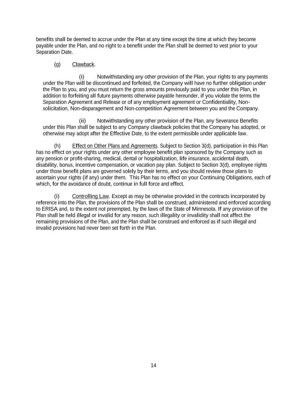 14 benefits shall be deemed to accrue under the Plan at any time except the time at which they become payable under the Plan, and no right to a benefit under the Plan shall be deemed to vest prior to your Separation Date. (g) Clawback. (i) Notwithstanding any other provision of the Plan, your rights to any payments under the Plan will be discontinued and forfeited, the Company will have no further obligation under the Plan to you, and you must return the gross amounts previously paid to you under this Plan, in addition to forfeiting all future payments otherwise payable hereunder, if you violate the terms the Separation Agreement and Release or of any employment agreement or Confidentiality, Non- solicitation, Non-disparagement and Non-competition Agreement between you and the Company. (ii) Notwithstanding any other provision of the Plan, any Severance Benefits under this Plan shall be subject to any Company clawback policies that the Company has adopted, or otherwise may adopt after the Effective Date, to the extent permissible under applicable law. (h) Effect on Other Plans and Agreements. Subject to Section 3(d), participation in this Plan has no effect on your rights under any other employee benefit plan sponsored by the Company such as any pension or profit-sharing, medical, dental or hospitalization, life insurance, accidental death, disability, bonus, incentive compensation, or vacation pay plan. Subject to Section 3(d), employee rights under those benefit plans are governed solely by their terms, and you should review those plans to ascertain your rights (if any) under them. This Plan has no effect on your Continuing Obligations, each of which, for the avoidance of doubt, continue in full force and effect. (i) Controlling Law. Except as may be otherwise provided in the contracts incorporated by reference into the Plan, the provisions of the Plan shall be construed, administered and enforced according to ERISA and, to the extent not preempted, by the laws of the State of Minnesota. If any provision of the Plan shall be held illegal or invalid for any reason, such illegality or invalidity shall not affect the remaining provisions of the Plan, and the Plan shall be construed and enforced as if such illegal and invalid provisions had never been set forth in the Plan.