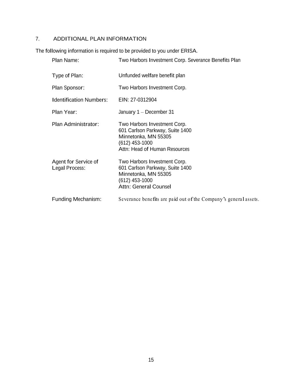 15 7. ADDITIONAL PLAN INFORMATION The following information is required to be provided to you under ERISA. Plan Name: Two Harbors Investment Corp. Severance Benefits Plan Type of Plan: Unfunded welfare benefit plan Plan Sponsor: Two Harbors Investment Corp. Identification Numbers: EIN: 27-0312904 Plan Year: January 1 – December 31 Plan Administrator: Two Harbors Investment Corp. 601 Carlson Parkway, Suite 1400 Minnetonka, MN 55305 (612) 453-1000 Attn: Head of Human Resources Agent for Service of Legal Process: Two Harbors Investment Corp. 601 Carlson Parkway, Suite 1400 Minnetonka, MN 55305 (612) 453-1000 Attn: General Counsel Funding Mechanism: Severance benefits are paid out of the Company’s general assets.