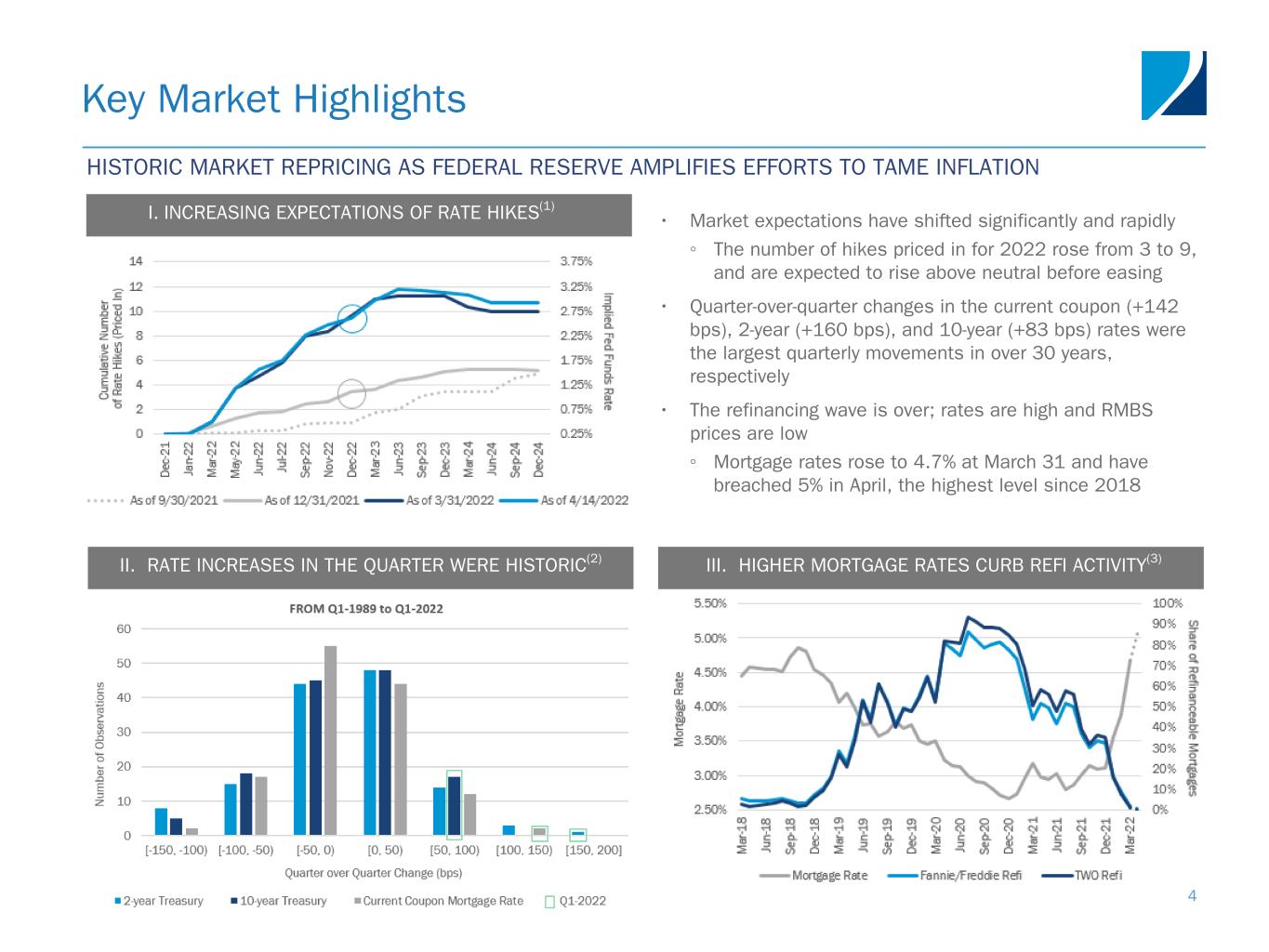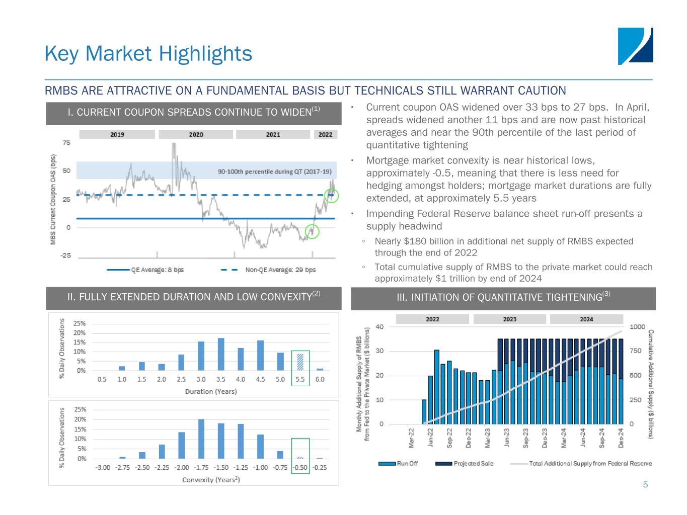 Key Market Highlights 4 II. RATE INCREASES IN THE QUARTER WERE HISTORIC(2) I. INCREASING EXPECTATIONS OF RATE HIKES(1) • Market expectations have shifted significantly and rapidly ◦ The number of hikes priced in for 2022 rose from 3 to 9, and are expected to rise above neutral before easing • Quarter-over-quarter changes in the current coupon (+142 bps), 2-year (+160 bps), and 10-year (+83 bps) rates were the largest quarterly movements in over 30 years, respectively • The refinancing wave is over; rates are high and RMBS prices are low ◦ Mortgage rates rose to 4.7% at March 31 and have breached 5% in April, the highest level since 2018 III. HIGHER MORTGAGE RATES CURB REFI ACTIVITY(3) HISTORIC MARKET REPRICING AS FEDERAL RESERVE AMPLIFIES EFFORTS TO TAME INFLATION