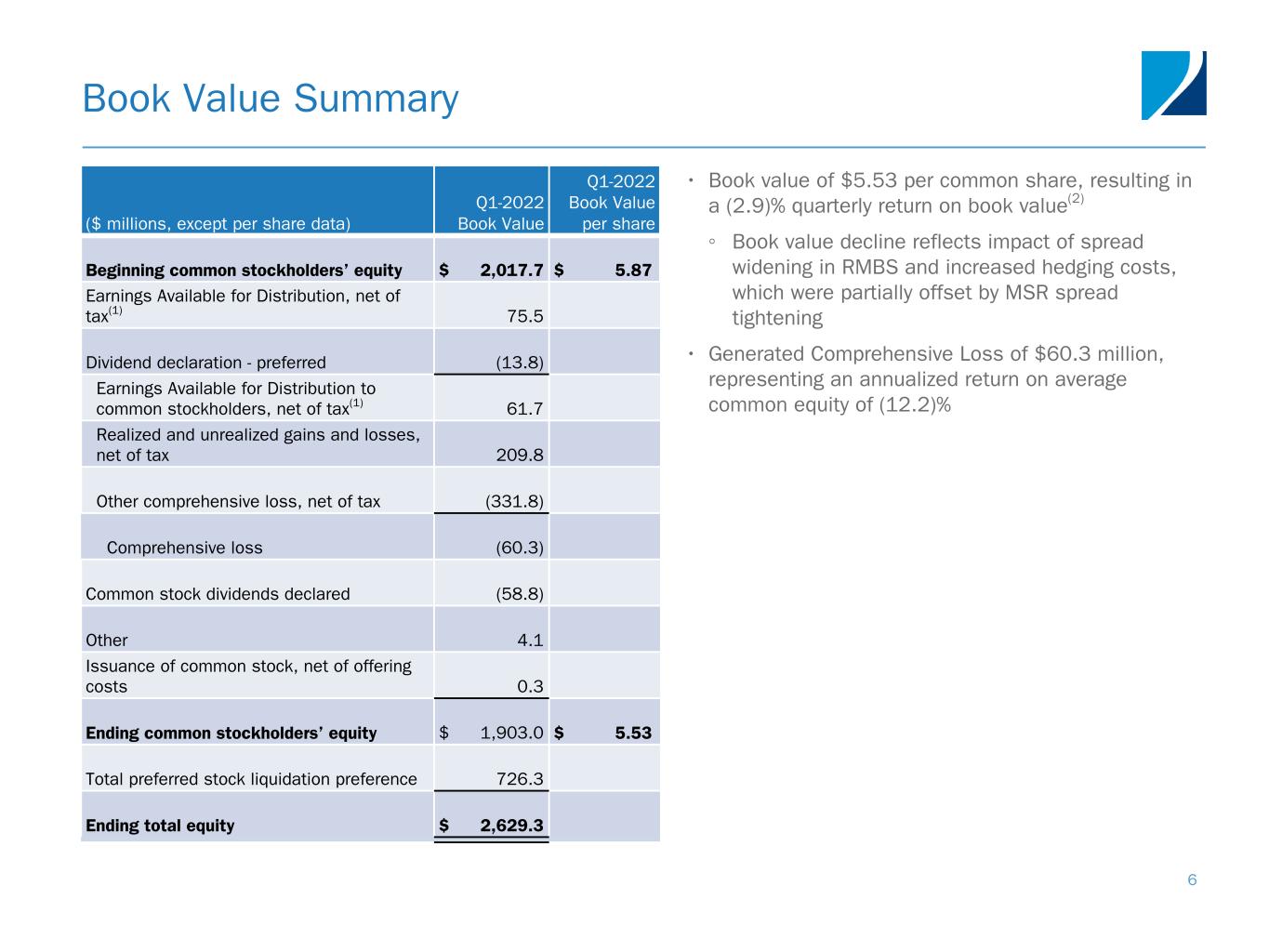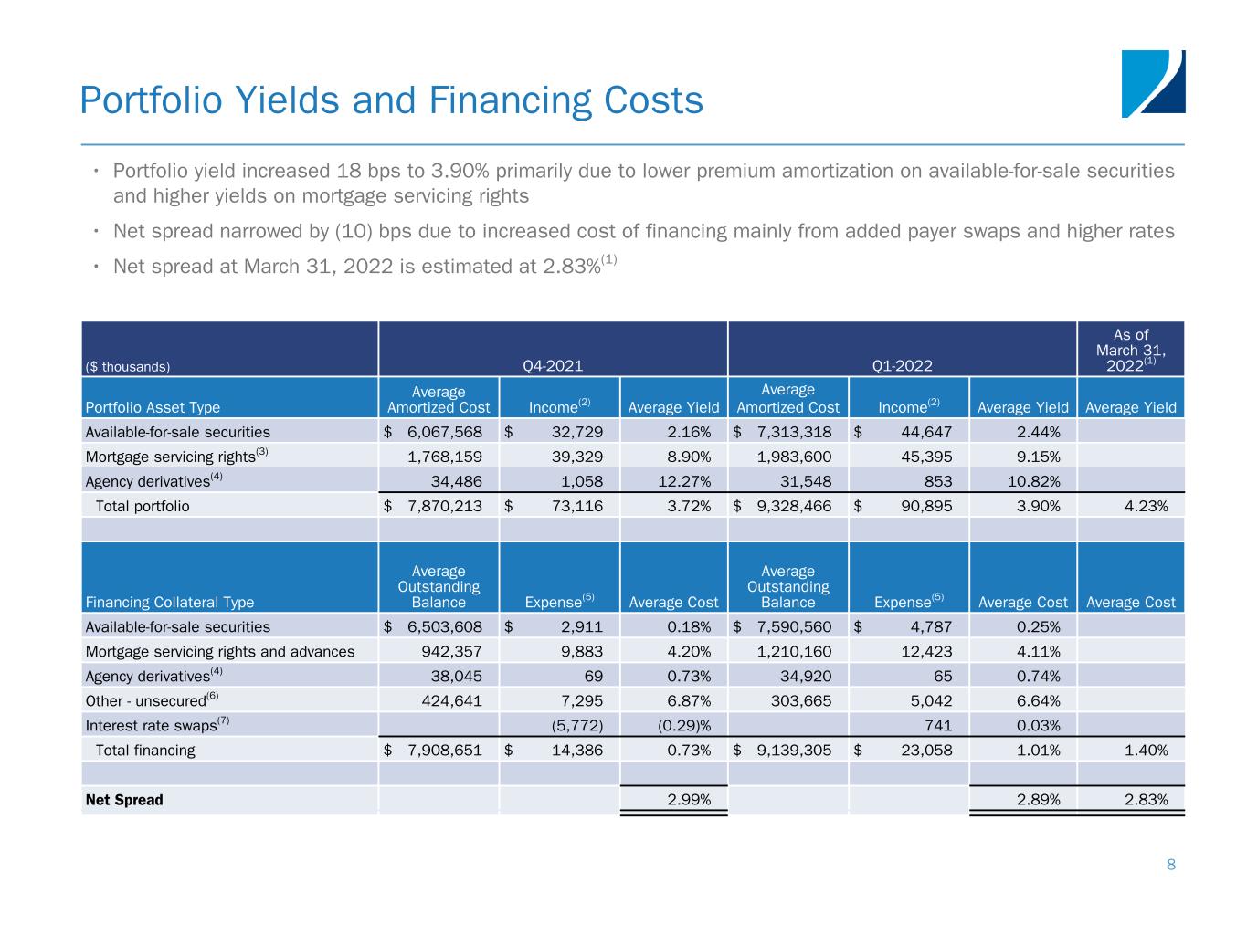 ($ millions, except per share data) Q4-2021 Q1-2022 Variance Interest income $ 33.0 $ 44.8 $ 11.8 Interest expense 20.2 22.3 (2.1) Net interest income 12.8 22.5 9.7 Servicing income 125.5 136.6 11.1 MSR amortization(1) (64.6) (67.2) (2.6) Interest spread income on interest rate swaps 5.8 (0.7) (6.5) TBA dollar roll income(2) 34.7 22.4 (12.3) U.S. Treasury futures income(3) 3.7 (0.3) (4.0) Other derivatives income 1.1 0.8 (0.3) Total other income 106.2 91.6 (14.6) Servicing expenses 21.6 24.1 (2.5) Operating expenses 9.8 13.9 (4.1) Total expenses 31.4 38.0 (6.6) Provision for income taxes 0.6 0.6 — Earnings Available for Distribution(4) $ 87.0 $ 75.5 $ (11.5) Dividends on preferred stock 13.7 13.8 (0.1) Earnings Available for Distribution available to common stockholders $ 73.3 $ 61.7 $ (11.6) Earnings Available for Distribution per weighted average basic common share $ 0.22 $ 0.18 Earnings Available for Disribution annualized return on average common equity 14.1 % 12.5 % Operating expenses, excluding non-cash LTIP amortization and nonrecurring expenses, as a percentage of average equity 1.4 % 2.1 % Earnings Available for Distribution 7 • First quarter EAD reflects: ◦ Higher interest income due to lower amortization as prepayment speeds slowed and, to a lesser degree, higher average Agency RMBS balance held ◦ Increased interest expense associated with rate increases and higher average RMBS and MSR borrowing balances, partially offset by reduced costs due to the maturity of convertible senior notes due 2022 ◦ Lower TBA dollar roll income primarily due to lower average notional balances ◦ Reduction in U.S. Treasury futures income as a result of net short position ◦ Increase in servicing income driven primarily by growth in the MSR portfolio with the settlement of $37.2 billion UPB in bulk acquisitions ◦ Higher operating expenses due to compensation accrual adjustment in the fourth quarter