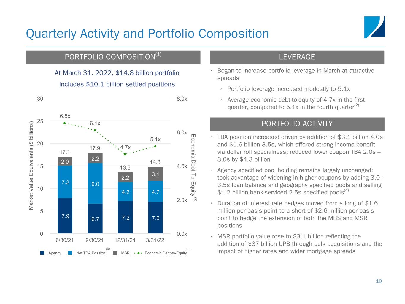 • $952 million of outstanding borrowings under bilateral MSR asset financing facilities • $400 million of outstanding 5-year MSR term notes(2) • $179 million of unused, committed MSR asset financing capacity • $19 million outstanding borrowings and $181 million of unused, committed capacity for servicing advance receivables Financing Profile 9 MORTGAGE SERVICING RIGHTS AGENCY RMBS Agency RMBS $7.0 billion Agency repurchase agreements $7.5 billion MSR $3.1 billion All other liabilities $0.5 billionCash & cash equivalents $0.6 billion Convertible debt $0.3 billion Preferred equity $0.7 billion Common equity $1.9 billionAll other assets $0.7 billion MSR financing $1.4 billion Restricted cash $0.9 billion BALANCE SHEET AS OF MARCH 31, 2022 STRONG LIQUIDITY POSITION • $7.5 billion of outstanding repurchase agreements with 19 counterparties • Although repo term rates increased during the quarter in anticipation of rate hikes, spread to SOFR remains low 2019 2020 2021 2022 (1 )