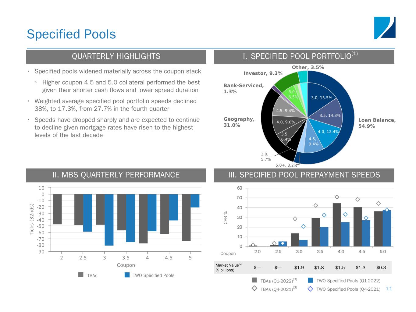 Quarterly Activity and Portfolio Composition 10 At March 31, 2022, $14.8 billion portfolio Includes $10.1 billion settled positions PORTFOLIO COMPOSITION(1) LEVERAGE M ar ke t V al ue E qu iv al en ts ($ b ill io ns ) E conom ic D ebt-To-E quity 17.1 17.9 13.6 14.8 7.9 6.7 7.2 7.0 7.2 9.0 4.2 4.7 2.0 2.2 2.2 3.1 6.5x 6.1x 4.7x 5.1x Agency Net TBA Position MSR Economic Debt-to-Equity 6/30/21 9/30/21 12/31/21 3/31/22 0 5 10 15 20 25 30 0.0x 2.0x 4.0x 6.0x 8.0x (3) (2 ) (2) • Began to increase portfolio leverage in March at attractive spreads ◦ Portfolio leverage increased modestly to 5.1x ◦ Average economic debt-to-equity of 4.7x in the first quarter, compared to 5.1x in the fourth quarter(2) • TBA position increased driven by addition of $3.1 billion 4.0s and $1.6 billion 3.5s, which offered strong income benefit via dollar roll specialness; reduced lower coupon TBA 2.0s – 3.0s by $4.3 billion • Agency specified pool holding remains largely unchanged: took advantage of widening in higher coupons by adding 3.0 - 3.5s loan balance and geography specified pools and selling $1.2 billion bank-serviced 2.5s specified pools(4) • Duration of interest rate hedges moved from a long of $1.6 million per basis point to a short of $2.6 million per basis point to hedge the extension of both the MBS and MSR positions • MSR portfolio value rose to $3.1 billion reflecting the addition of $37 billion UPB through bulk acquisitions and the impact of higher rates and wider mortgage spreads PORTFOLIO ACTIVITY