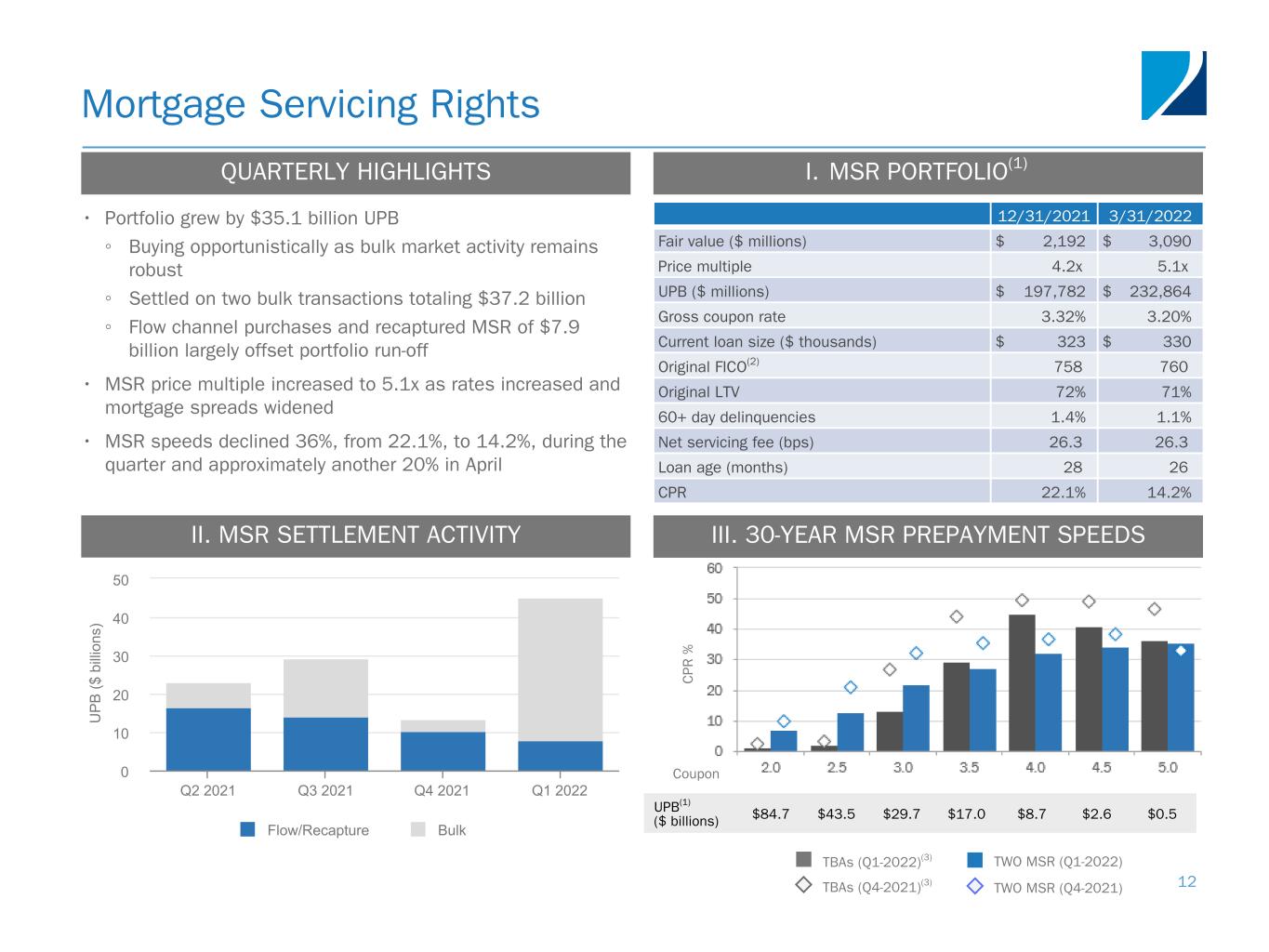 II. MBS QUARTERLY PERFORMANCE • Specified pools widened materially across the coupon stack ◦ Higher coupon 4.5 and 5.0 collateral performed the best given their shorter cash flows and lower spread duration • Weighted average specified pool portfolio speeds declined 38%, to 17.3%, from 27.7% in the fourth quarter • Speeds have dropped sharply and are expected to continue to decline given mortgage rates have risen to the highest levels of the last decade C PR % Specified Pools I. SPECIFIED POOL PORTFOLIO(1) 11 III. SPECIFIED POOL PREPAYMENT SPEEDS TWO Specified PoolsTBAs TWO Specified Pools (Q1-2022)TBAs (Q1-2022)(3) TBAs (Q4-2021)(3) TWO Specified Pools (Q4-2021) Market Value(2) ($ billions) $— $— $1.9 $1.8 $1.5 $1.3 $0.3 Coupon QUARTERLY HIGHLIGHTS