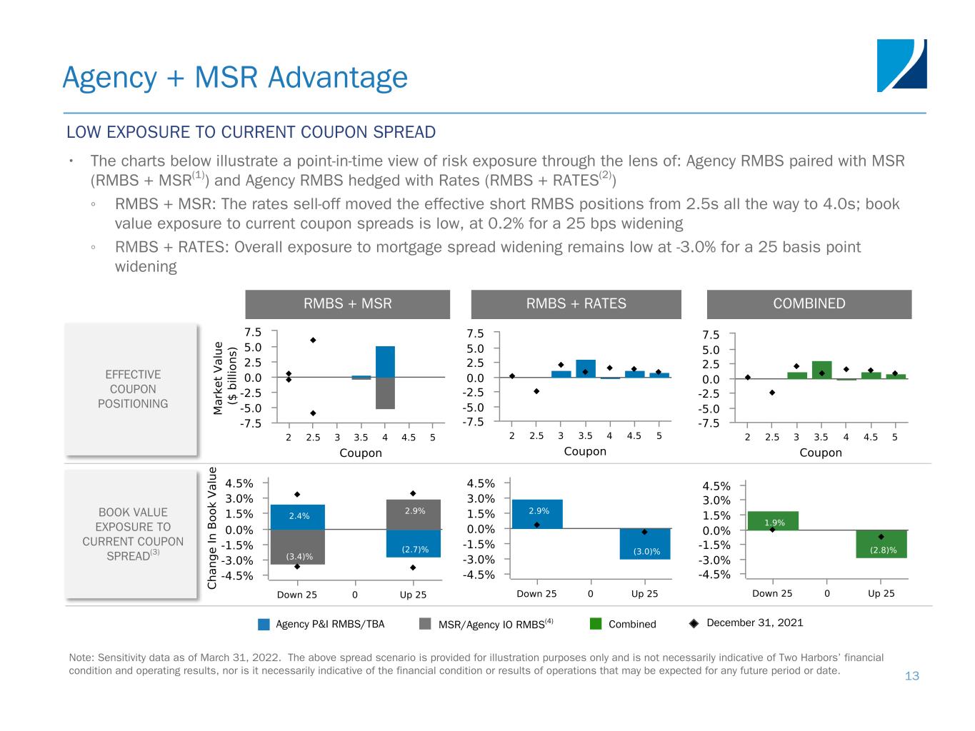 • Portfolio grew by $35.1 billion UPB ◦ Buying opportunistically as bulk market activity remains robust ◦ Settled on two bulk transactions totaling $37.2 billion ◦ Flow channel purchases and recaptured MSR of $7.9 billion largely offset portfolio run-off • MSR price multiple increased to 5.1x as rates increased and mortgage spreads widened • MSR speeds declined 36%, from 22.1%, to 14.2%, during the quarter and approximately another 20% in April Mortgage Servicing Rights 12 II. MSR SETTLEMENT ACTIVITY III. 30-YEAR MSR PREPAYMENT SPEEDS 12/31/2021 3/31/2022 Fair value ($ millions) $ 2,192 $ 3,090 Price multiple 4.2x 5.1x UPB ($ millions) $ 197,782 $ 232,864 Gross coupon rate 3.32 % 3.20 % Current loan size ($ thousands) $ 323 $ 330 Original FICO(2) 758 760 Original LTV 72 % 71 % 60+ day delinquencies 1.4 % 1.1 % Net servicing fee (bps) 26.3 26.3 Loan age (months) 28 26 CPR 22.1 % 14.2 % I. MSR PORTFOLIO(1) TWO MSR (Q1-2022)TBAs (Q1-2022)(3) TBAs (Q4-2021)(3) TWO MSR (Q4-2021) UPB(1) ($ billions) $84.7 $43.5 $29.7 $17.0 $8.7 $2.6 $0.5 C PR % Coupon U P B ($ b ill io ns ) Flow/Recapture Bulk Q2 2021 Q3 2021 Q4 2021 Q1 2022 0 10 20 30 40 50 QUARTERLY HIGHLIGHTS