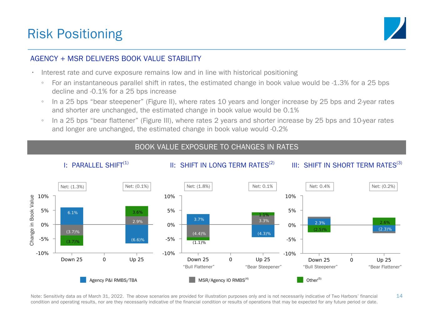 Agency + MSR Advantage 13 COMBINED Agency P&I RMBS/TBA MSR/Agency IO RMBS(4) Combined December 31, 2021 Note: Sensitivity data as of March 31, 2022. The above spread scenario is provided for illustration purposes only and is not necessarily indicative of Two Harbors’ financial condition and operating results, nor is it necessarily indicative of the financial condition or results of operations that may be expected for any future period or date. RMBS + MSR RMBS + RATES LOW EXPOSURE TO CURRENT COUPON SPREAD • The charts below illustrate a point-in-time view of risk exposure through the lens of: Agency RMBS paired with MSR (RMBS + MSR(1)) and Agency RMBS hedged with Rates (RMBS + RATES(2)) ◦ RMBS + MSR: The rates sell-off moved the effective short RMBS positions from 2.5s all the way to 4.0s; book value exposure to current coupon spreads is low, at 0.2% for a 25 bps widening ◦ RMBS + RATES: Overall exposure to mortgage spread widening remains low at -3.0% for a 25 basis point widening BOOK VALUE EXPOSURE TO CURRENT COUPON SPREAD(3) EFFECTIVE COUPON POSITIONING