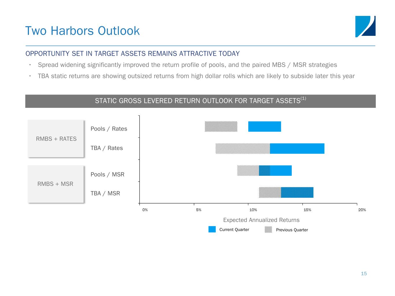 Note: Sensitivity data as of March 31, 2022. The above scenarios are provided for illustration purposes only and is not necessarily indicative of Two Harbors’ financial condition and operating results, nor are they necessarily indicative of the financial condition or results of operations that may be expected for any future period or date. Risk Positioning 14 AGENCY + MSR DELIVERS BOOK VALUE STABILITY Agency P&I RMBS/TBA MSR/Agency IO RMBS(4) Other(5) BOOK VALUE EXPOSURE TO CHANGES IN RATES II: SHIFT IN LONG TERM RATES(2)I: PARALLEL SHIFT(1) III: SHIFT IN SHORT TERM RATES(3) C ha ng e in B oo k Va lu e Net: (1.3%) Net: (0.1%) Net: 0.4% Net: (0.2%)Net: (1.8%) Net: 0.1% • Interest rate and curve exposure remains low and in line with historical positioning ◦ For an instantaneous parallel shift in rates, the estimated change in book value would be -1.3% for a 25 bps decline and -0.1% for a 25 bps increase ◦ In a 25 bps “bear steepener” (Figure II), where rates 10 years and longer increase by 25 bps and 2-year rates and shorter are unchanged, the estimated change in book value would be 0.1% ◦ In a 25 bps “bear flattener” (Figure III), where rates 2 years and shorter increase by 25 bps and 10-year rates and longer are unchanged, the estimated change in book value would -0.2% “Bear Flattener”“Bull Steepener”“Bear Steepener”“Bull Flattener”