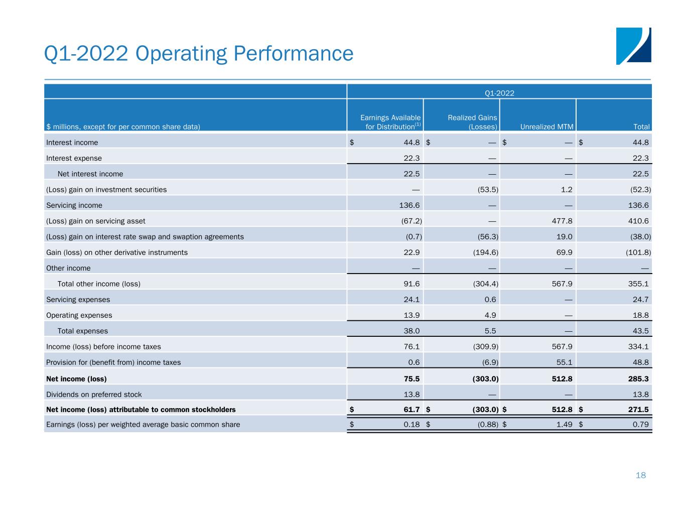 Q1-2022 Operating Performance Q1-2022 $ millions, except for per common share data) Earnings Available for Distribution(1) Realized Gains (Losses) Unrealized MTM Total Interest income $ 44.8 $ — $ — $ 44.8 Interest expense 22.3 — — 22.3 Net interest income 22.5 — — 22.5 (Loss) gain on investment securities — (53.5) 1.2 (52.3) Servicing income 136.6 — — 136.6 (Loss) gain on servicing asset (67.2) — 477.8 410.6 (Loss) gain on interest rate swap and swaption agreements (0.7) (56.3) 19.0 (38.0) Gain (loss) on other derivative instruments 22.9 (194.6) 69.9 (101.8) Other income — — — — Total other income (loss) 91.6 (304.4) 567.9 355.1 Servicing expenses 24.1 0.6 — 24.7 Operating expenses 13.9 4.9 — 18.8 Total expenses 38.0 5.5 — 43.5 Income (loss) before income taxes 76.1 (309.9) 567.9 334.1 Provision for (benefit from) income taxes 0.6 (6.9) 55.1 48.8 Net income (loss) 75.5 (303.0) 512.8 285.3 Dividends on preferred stock 13.8 — — 13.8 Net income (loss) attributable to common stockholders $ 61.7 $ (303.0) $ 512.8 $ 271.5 Earnings (loss) per weighted average basic common share $ 0.18 $ (0.88) $ 1.49 $ 0.79 18