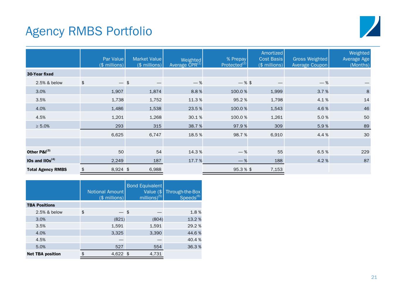 GAAP to EAD Reconciliation Reconciliation of GAAP to non-GAAP Information Three Months Ended Three Months Ended ($ thousands, except for per common share data) December 31, 2021 March 31, 2022 Comprehensive loss attributable to common stockholders $ (128,594) $ (60,322) Adjustment for other comprehensive loss attributable to common stockholders: Unrealized loss on available-for-sale securities 113,553 331,845 Net (loss) income attributable to common stockholders $ (15,041) $ 271,523 Adjustments to exclude reported realized and unrealized (gains) losses: Realized (gain) loss on securities (28,912) 52,394 Unrealized loss (gain) on securities 23,939 (1,166) Provision for credit losses 3,347 1,114 Realized and unrealized loss (gain) on mortgage servicing rights 131,828 (410,624) Realized loss on termination or expiration of interest rate swaps and swaptions 5,143 56,264 Unrealized gain on interest rate swaps and swaptions (36,360) (18,964) Realized and unrealized loss on other derivative instruments 12,624 102,615 Other realized and unrealized (gains) losses (1,856) 44 Other adjustments: MSR amortization(1) (64,631) (67,179) TBA dollar roll income(2) 34,781 22,405 U.S. Treasury futures income(3) 3,711 (329) Change in servicing reserves (22) 608 Non-cash equity compensation expense 2,525 4,161 Other nonrecurring expenses 665 689 Net provision for income taxes on non-Core Earnings 1,535 48,191 Earnings available for distribution to common stockholders $ 73,276 $ 61,746 Weighted average basic common shares 335,100,737 343,998,511 Earnings available for distribution to common stockholders per weighted average basic common share $ 0.22 $ 0.18 20 Note: Earnings Available for Distribution, or EAD, is a non-GAAP measure that we define as comprehensive loss attributable to common stockholders, excluding realized and unrealized gains and losses on the aggregate portfolio, provision for (reversal of) credit losses, reserve expense for representation and warranty obligations on MSR, non-cash compensation expense related to restricted common stock, and other nonrecurring expenses. As defined, EAD includes net interest income, accrual and settlement of interest on derivatives, dollar roll income on TBAs, U.S. Treasury futures income, servicing income, net of estimated amortization on MSR and recurring cash related operating expenses. EAD provides supplemental information to assist investors in analyzing the Company’s results of operations and helps facilitate comparisons to industry peers. EAD is one of several measures our board of directors considers to determine the amount of dividends to declare on our common stock and should not be considered an indication of our taxable income or as a proxy for the amount of dividends we may declare.