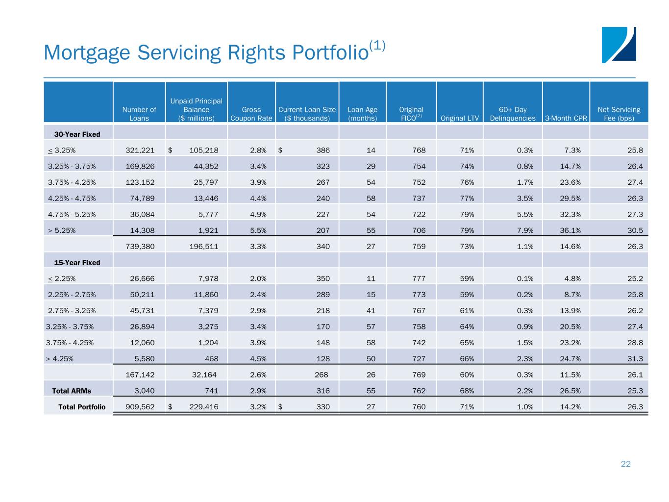 Mortgage Servicing Rights Portfolio(1) 22 Number of Loans Unpaid Principal Balance ($ millions) Gross Coupon Rate Current Loan Size ($ thousands) Loan Age (months) Original FICO(2) Original LTV 60+ Day Delinquencies 3-Month CPR Net Servicing Fee (bps) 30-Year Fixed < 3.25% 321,221 $ 105,218 2.8% $ 386 14 768 71% 0.3% 7.3% 25.8 3.25% - 3.75% 169,826 44,352 3.4% 323 29 754 74% 0.8% 14.7% 26.4 3.75% - 4.25% 123,152 25,797 3.9 % 267 54 752 76 % 1.7 % 23.6 % 27.4 4.25% - 4.75% 74,789 13,446 4.4 % 240 58 737 77 % 3.5 % 29.5 % 26.3 4.75% - 5.25% 36,084 5,777 4.9 % 227 54 722 79 % 5.5 % 32.3 % 27.3 > 5.25% 14,308 1,921 5.5 % 207 55 706 79 % 7.9 % 36.1 % 30.5 739,380 196,511 3.3 % 340 27 759 73 % 1.1 % 14.6 % 26.3 15-Year Fixed < 2.25% 26,666 7,978 2.0 % 350 11 777 59 % 0.1 % 4.8 % 25.2 2.25% - 2.75% 50,211 11,860 2.4 % 289 15 773 59 % 0.2 % 8.7 % 25.8 2.75% - 3.25% 45,731 7,379 2.9 % 218 41 767 61 % 0.3 % 13.9 % 26.2 3.25% - 3.75% 26,894 3,275 3.4 % 170 57 758 64 % 0.9 % 20.5 % 27.4 3.75% - 4.25% 12,060 1,204 3.9 % 148 58 742 65 % 1.5 % 23.2 % 28.8 > 4.25% 5,580 468 4.5 % 128 50 727 66 % 2.3 % 24.7 % 31.3 167,142 32,164 2.6 % 268 26 769 60 % 0.3 % 11.5 % 26.1 Total ARMs 3,040 741 2.9 % 316 55 762 68 % 2.2 % 26.5 % 25.3 Total Portfolio 909,562 $ 229,416 3.2 % $ 330 27 760 71 % 1.0 % 14.2 % 26.3