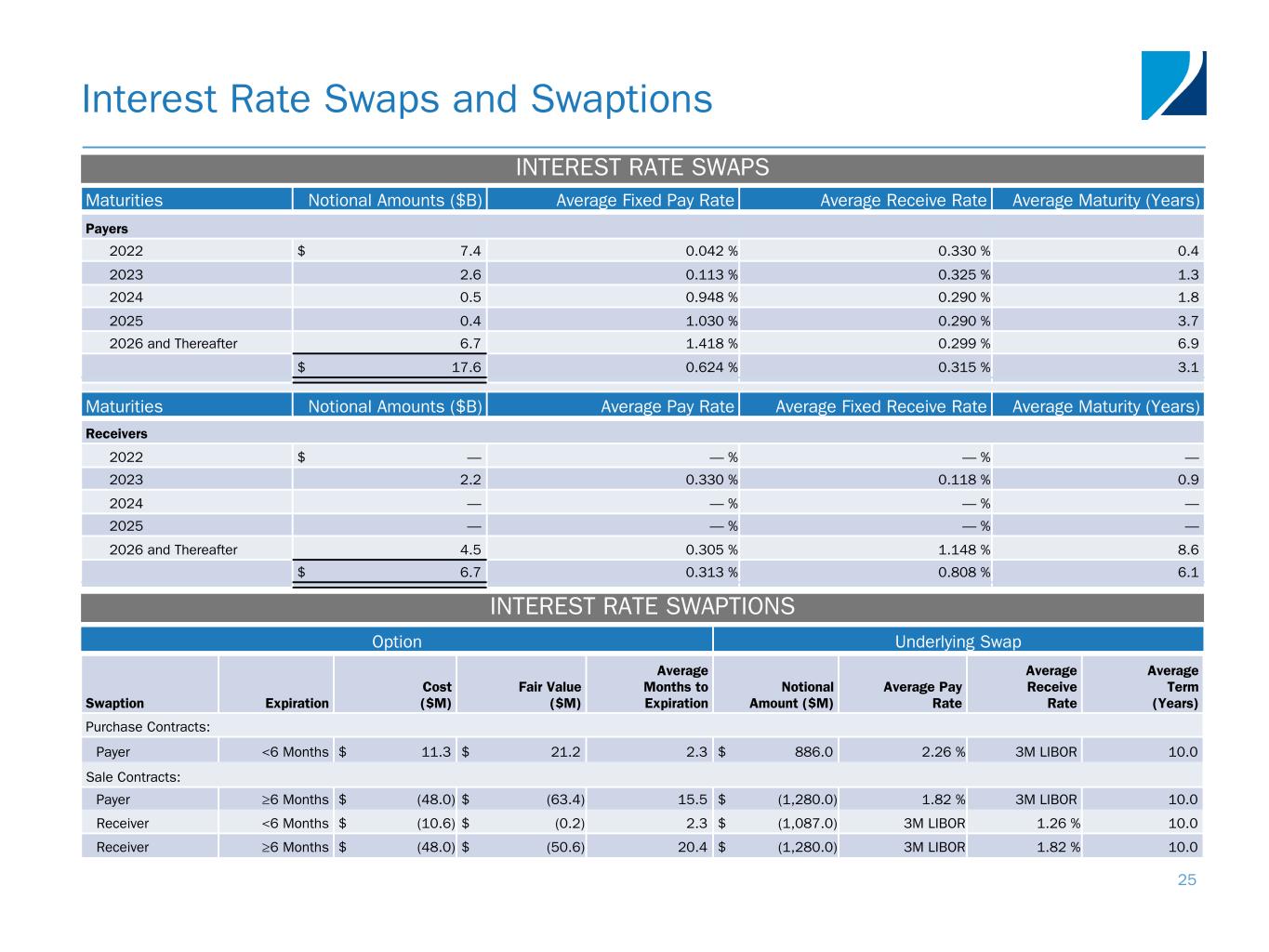 Maturities Notional Amounts ($B) Average Fixed Pay Rate Average Receive Rate Average Maturity (Years) Payers 2022 $ 7.4 0.042 % 0.330 % 0.4 2023 2.6 0.113 % 0.325 % 1.3 2024 0.5 0.948 % 0.290 % 1.8 2025 0.4 1.030 % 0.290 % 3.7 2026 and Thereafter 6.7 1.418 % 0.299 % 6.9 $ 17.6 0.624 % 0.315 % 3.1 Maturities Notional Amounts ($B) Average Pay Rate Average Fixed Receive Rate Average Maturity (Years) Receivers 2022 $ — — % — % — 2023 2.2 0.330 % 0.118 % 0.9 2024 — — % — % — 2025 — — % — % — 2026 and Thereafter 4.5 0.305 % 1.148 % 8.6 $ 6.7 0.313 % 0.808 % 6.1 Interest Rate Swaps and Swaptions 25 INTEREST RATE SWAPS Option Underlying Swap Swaption Expiration Cost ($M) Fair Value ($M) Average Months to Expiration Notional Amount ($M) Average Pay Rate Average Receive Rate Average Term (Years) Purchase Contracts: Payer <6 Months $ 11.3 $ 21.2 2.3 $ 886.0 2.26 % 3M LIBOR 10.0 Sale Contracts: Payer ≥6 Months $ (48.0) $ (63.4) 15.5 $ (1,280.0) 1.82 % 3M LIBOR 10.0 Receiver <6 Months $ (10.6) $ (0.2) 2.3 $ (1,087.0) 3M LIBOR 1.26 % 10.0 Receiver ≥6 Months $ (48.0) $ (50.6) 20.4 $ (1,280.0) 3M LIBOR 1.82 % 10.0 INTEREST RATE SWAPTIONS