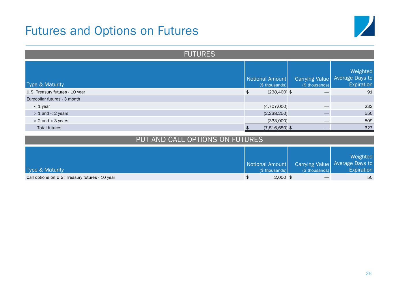 Type & Maturity Notional Amount ($ thousands) Carrying Value ($ thousands) Weighted Average Days to Expiration U.S. Treasury futures - 10 year $ (238,400) $ — 91 Eurodollar futures - 3 month < 1 year (4,707,000) — 232 > 1 and < 2 years (2,238,250) — 550 > 2 and < 3 years (333,000) — 809 Total futures $ (7,516,650) $ — 327 Futures and Options on Futures 26 FUTURES PUT AND CALL OPTIONS ON FUTURES Type & Maturity Notional Amount ($ thousands) Carrying Value ($ thousands) Weighted Average Days to Expiration Call options on U.S. Treasury futures - 10 year $ 2,000 $ — 50