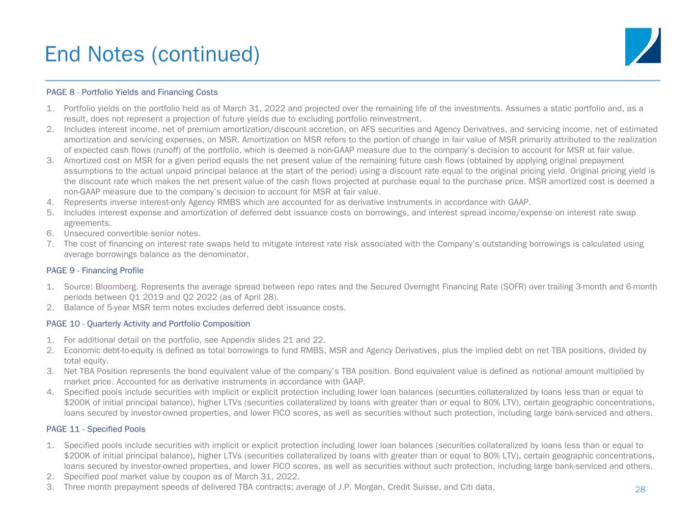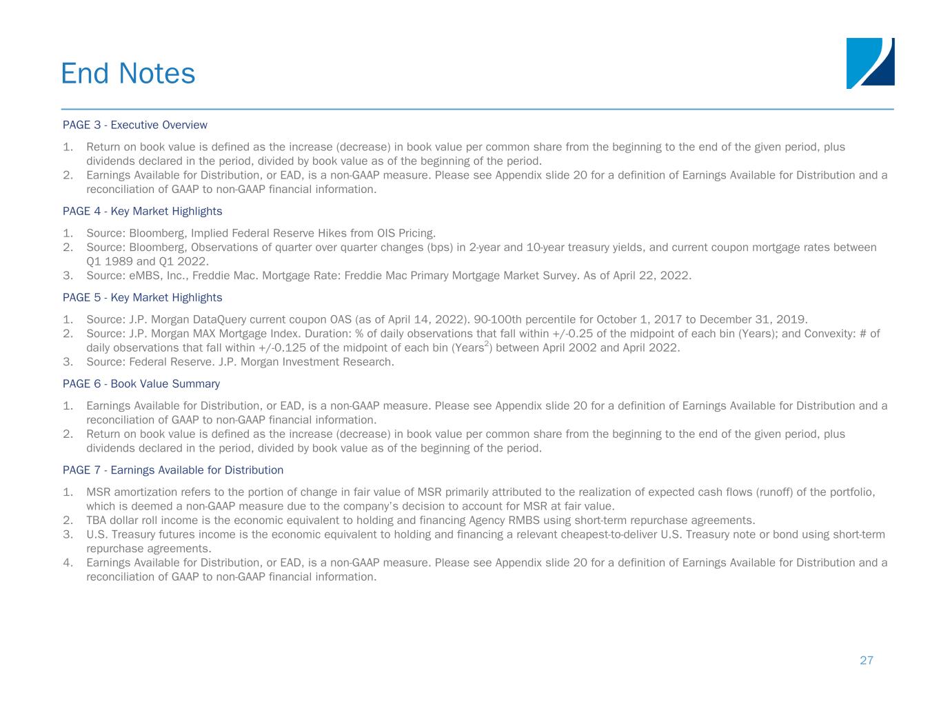 End Notes 27 PAGE 3 - Executive Overview 1. Return on book value is defined as the increase (decrease) in book value per common share from the beginning to the end of the given period, plus dividends declared in the period, divided by book value as of the beginning of the period. 2. Earnings Available for Distribution, or EAD, is a non-GAAP measure. Please see Appendix slide 20 for a definition of Earnings Available for Distribution and a reconciliation of GAAP to non-GAAP financial information. PAGE 4 - Key Market Highlights 1. Source: Bloomberg, Implied Federal Reserve Hikes from OIS Pricing. 2. Source: Bloomberg, Observations of quarter over quarter changes (bps) in 2-year and 10-year treasury yields, and current coupon mortgage rates between Q1 1989 and Q1 2022. 3. Source: eMBS, Inc., Freddie Mac. Mortgage Rate: Freddie Mac Primary Mortgage Market Survey. As of April 22, 2022. PAGE 5 - Key Market Highlights 1. Source: J.P. Morgan DataQuery current coupon OAS (as of April 14, 2022). 90-100th percentile for October 1, 2017 to December 31, 2019. 2. Source: J.P. Morgan MAX Mortgage Index. Duration: % of daily observations that fall within +/-0.25 of the midpoint of each bin (Years); and Convexity: # of daily observations that fall within +/-0.125 of the midpoint of each bin (Years2) between April 2002 and April 2022. 3. Source: Federal Reserve. J.P. Morgan Investment Research. PAGE 6 - Book Value Summary 1. Earnings Available for Distribution, or EAD, is a non-GAAP measure. Please see Appendix slide 20 for a definition of Earnings Available for Distribution and a reconciliation of GAAP to non-GAAP financial information. 2. Return on book value is defined as the increase (decrease) in book value per common share from the beginning to the end of the given period, plus dividends declared in the period, divided by book value as of the beginning of the period. PAGE 7 - Earnings Available for Distribution 1. MSR amortization refers to the portion of change in fair value of MSR primarily attributed to the realization of expected cash flows (runoff) of the portfolio, which is deemed a non-GAAP measure due to the company’s decision to account for MSR at fair value. 2. TBA dollar roll income is the economic equivalent to holding and financing Agency RMBS using short-term repurchase agreements. 3. U.S. Treasury futures income is the economic equivalent to holding and financing a relevant cheapest-to-deliver U.S. Treasury note or bond using short-term repurchase agreements. 4. Earnings Available for Distribution, or EAD, is a non-GAAP measure. Please see Appendix slide 20 for a definition of Earnings Available for Distribution and a reconciliation of GAAP to non-GAAP financial information.