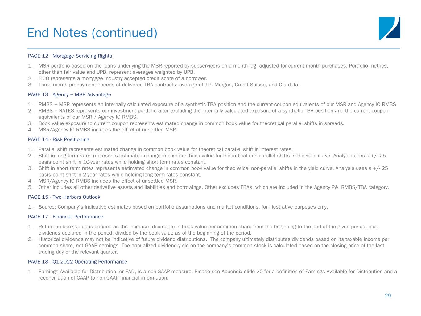 End Notes (continued) 28 PAGE 8 - Portfolio Yields and Financing Costs 1. Portfolio yields on the portfolio held as of March 31, 2022 and projected over the remaining life of the investments. Assumes a static portfolio and, as a result, does not represent a projection of future yields due to excluding portfolio reinvestment. 2. Includes interest income, net of premium amortization/discount accretion, on AFS securities and Agency Derivatives, and servicing income, net of estimated amortization and servicing expenses, on MSR. Amortization on MSR refers to the portion of change in fair value of MSR primarily attributed to the realization of expected cash flows (runoff) of the portfolio, which is deemed a non-GAAP measure due to the company’s decision to account for MSR at fair value. 3. Amortized cost on MSR for a given period equals the net present value of the remaining future cash flows (obtained by applying original prepayment assumptions to the actual unpaid principal balance at the start of the period) using a discount rate equal to the original pricing yield. Original pricing yield is the discount rate which makes the net present value of the cash flows projected at purchase equal to the purchase price. MSR amortized cost is deemed a non-GAAP measure due to the company’s decision to account for MSR at fair value. 4. Represents inverse interest-only Agency RMBS which are accounted for as derivative instruments in accordance with GAAP. 5. Includes interest expense and amortization of deferred debt issuance costs on borrowings, and interest spread income/expense on interest rate swap agreements. 6. Unsecured convertible senior notes. 7. The cost of financing on interest rate swaps held to mitigate interest rate risk associated with the Company’s outstanding borrowings is calculated using average borrowings balance as the denominator. PAGE 9 - Financing Profile 1. Source: Bloomberg. Represents the average spread between repo rates and the Secured Overnight Financing Rate (SOFR) over trailing 3-month and 6-month periods between Q1 2019 and Q2 2022 (as of April 28). 2. Balance of 5-year MSR term notes excludes deferred debt issuance costs. PAGE 10 - Quarterly Activity and Portfolio Composition 1. For additional detail on the portfolio, see Appendix slides 21 and 22. 2. Economic debt-to-equity is defined as total borrowings to fund RMBS, MSR and Agency Derivatives, plus the implied debt on net TBA positions, divided by total equity. 3. Net TBA Position represents the bond equivalent value of the company’s TBA position. Bond equivalent value is defined as notional amount multiplied by market price. Accounted for as derivative instruments in accordance with GAAP. 4. Specified pools include securities with implicit or explicit protection including lower loan balances (securities collateralized by loans less than or equal to $200K of initial principal balance), higher LTVs (securities collateralized by loans with greater than or equal to 80% LTV), certain geographic concentrations, loans secured by investor-owned properties, and lower FICO scores, as well as securities without such protection, including large bank-serviced and others. PAGE 11 - Specified Pools 1. Specified pools include securities with implicit or explicit protection including lower loan balances (securities collateralized by loans less than or equal to $200K of initial principal balance), higher LTVs (securities collateralized by loans with greater than or equal to 80% LTV), certain geographic concentrations, loans secured by investor-owned properties, and lower FICO scores, as well as securities without such protection, including large bank-serviced and others. 2. Specified pool market value by coupon as of March 31, 2022. 3. Three month prepayment speeds of delivered TBA contracts; average of J.P. Morgan, Credit Suisse, and Citi data.