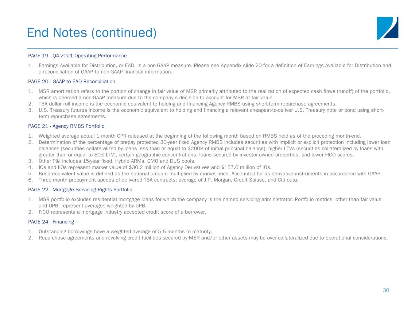 End Notes (continued) 30 PAGE 19 - Q4-2021 Operating Performance 1. Earnings Available for Distribution, or EAD, is a non-GAAP measure. Please see Appendix slide 20 for a definition of Earnings Available for Distribution and a reconciliation of GAAP to non-GAAP financial information. PAGE 20 - GAAP to EAD Reconciliation 1. MSR amortization refers to the portion of change in fair value of MSR primarily attributed to the realization of expected cash flows (runoff) of the portfolio, which is deemed a non-GAAP measure due to the company’s decision to account for MSR at fair value. 2. TBA dollar roll income is the economic equivalent to holding and financing Agency RMBS using short-term repurchase agreements. 3. U.S. Treasury futures income is the economic equivalent to holding and financing a relevant cheapest-to-deliver U.S. Treasury note or bond using short- term repurchase agreements. PAGE 21 - Agency RMBS Portfolio 1. Weighted average actual 1 month CPR released at the beginning of the following month based on RMBS held as of the preceding month-end. 2. Determination of the percentage of prepay protected 30-year fixed Agency RMBS includes securities with implicit or explicit protection including lower loan balances (securities collateralized by loans less than or equal to $200K of initial principal balance), higher LTVs (securities collateralized by loans with greater than or equal to 80% LTV), certain geographic concentrations, loans secured by investor-owned properties, and lower FICO scores. 3. Other P&I includes 15-year fixed, Hybrid ARMs, CMO and DUS pools. 4. IOs and IIOs represent market value of $30.2 million of Agency Derivatives and $157.0 million of IOs. 5. Bond equivalent value is defined as the notional amount multiplied by market price. Accounted for as derivative instruments in accordance with GAAP. 6. Three month prepayment speeds of delivered TBA contracts; average of J.P. Morgan, Credit Suisse, and Citi data. PAGE 22 - Mortgage Servicing Rights Portfolio 1. MSR portfolio excludes residential mortgage loans for which the company is the named servicing administrator. Portfolio metrics, other than fair value and UPB, represent averages weighted by UPB. 2. FICO represents a mortgage industry accepted credit score of a borrower. PAGE 24 - Financing 1. Outstanding borrowings have a weighted average of 5.5 months to maturity. 2. Repurchase agreements and revolving credit facilities secured by MSR and/or other assets may be over-collateralized due to operational considerations.