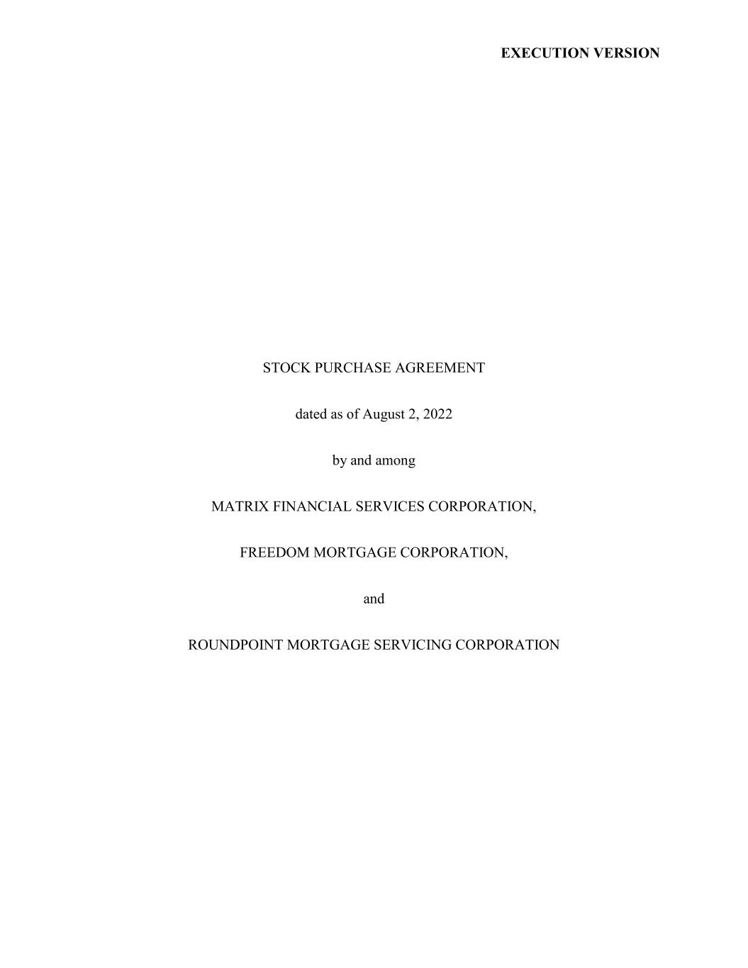 EXECUTION VERSION STOCK PURCHASE AGREEMENT dated as of August 2, 2022 by and among MATRIX FINANCIAL SERVICES CORPORATION, FREEDOM MORTGAGE CORPORATION, and ROUNDPOINT MORTGAGE SERVICING CORPORATION