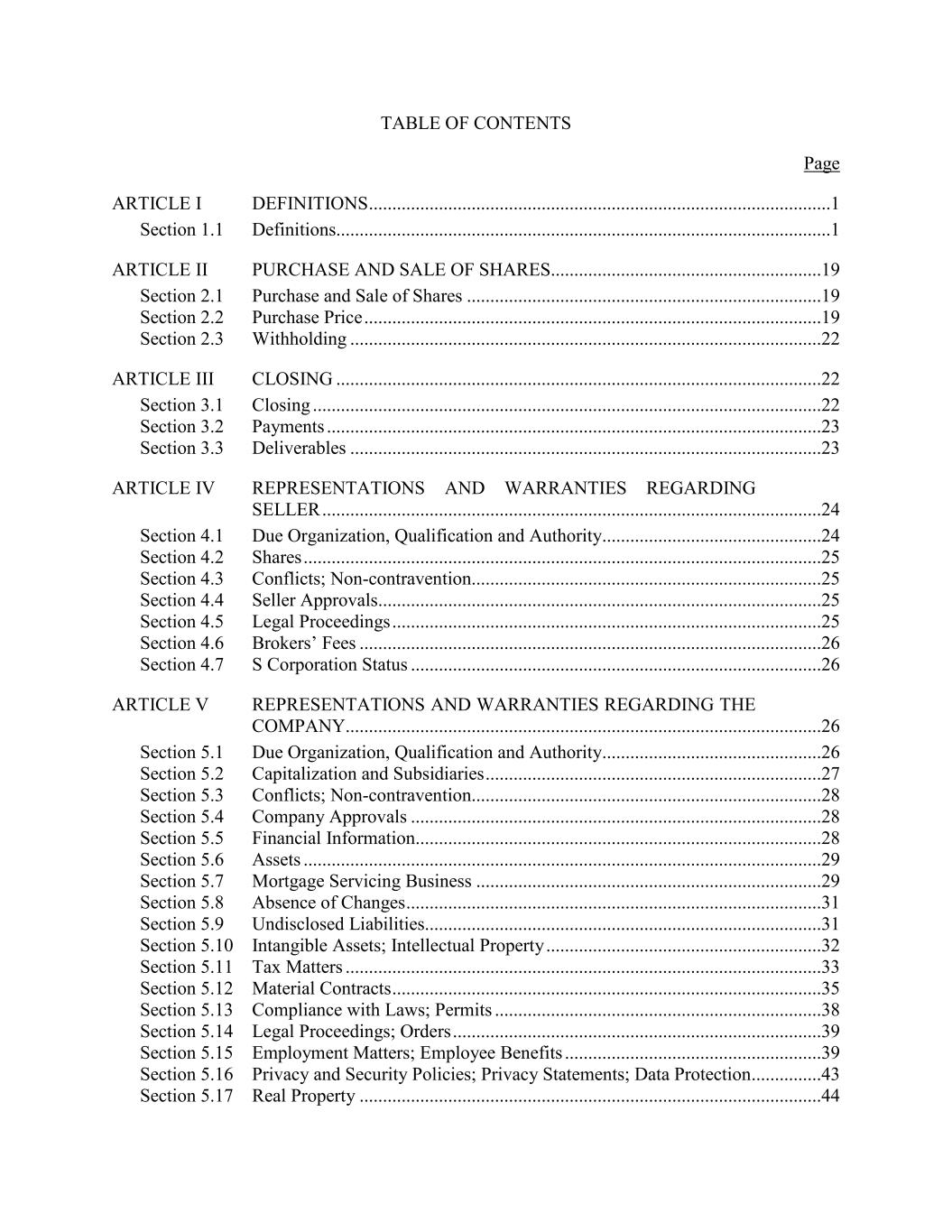 TABLE OF CONTENTS Page ARTICLE I DEFINITIONS ...................................................................................................1 Section 1.1 Definitions..........................................................................................................1 ARTICLE II PURCHASE AND SALE OF SHARES..........................................................19 Section 2.1 Purchase and Sale of Shares ............................................................................19 Section 2.2 Purchase Price ..................................................................................................19 Section 2.3 Withholding .....................................................................................................22 ARTICLE III CLOSING ........................................................................................................22 Section 3.1 Closing .............................................................................................................22 Section 3.2 Payments ..........................................................................................................23 Section 3.3 Deliverables .....................................................................................................23 ARTICLE IV REPRESENTATIONS AND WARRANTIES REGARDING SELLER ...........................................................................................................24 Section 4.1 Due Organization, Qualification and Authority ...............................................24 Section 4.2 Shares ...............................................................................................................25 Section 4.3 Conflicts; Non-contravention...........................................................................25 Section 4.4 Seller Approvals...............................................................................................25 Section 4.5 Legal Proceedings ............................................................................................25 Section 4.6 Brokers’ Fees ...................................................................................................26 Section 4.7 S Corporation Status ........................................................................................26 ARTICLE V REPRESENTATIONS AND WARRANTIES REGARDING THE COMPANY......................................................................................................26 Section 5.1 Due Organization, Qualification and Authority ...............................................26 Section 5.2 Capitalization and Subsidiaries ........................................................................27 Section 5.3 Conflicts; Non-contravention...........................................................................28 Section 5.4 Company Approvals ........................................................................................28 Section 5.5 Financial Information.......................................................................................28 Section 5.6 Assets ...............................................................................................................29 Section 5.7 Mortgage Servicing Business ..........................................................................29 Section 5.8 Absence of Changes .........................................................................................31 Section 5.9 Undisclosed Liabilities.....................................................................................31 Section 5.10 Intangible Assets; Intellectual Property ...........................................................32 Section 5.11 Tax Matters ......................................................................................................33 Section 5.12 Material Contracts ............................................................................................35 Section 5.13 Compliance with Laws; Permits ......................................................................38 Section 5.14 Legal Proceedings; Orders ...............................................................................39 Section 5.15 Employment Matters; Employee Benefits .......................................................39 Section 5.16 Privacy and Security Policies; Privacy Statements; Data Protection ...............43 Section 5.17 Real Property ...................................................................................................44