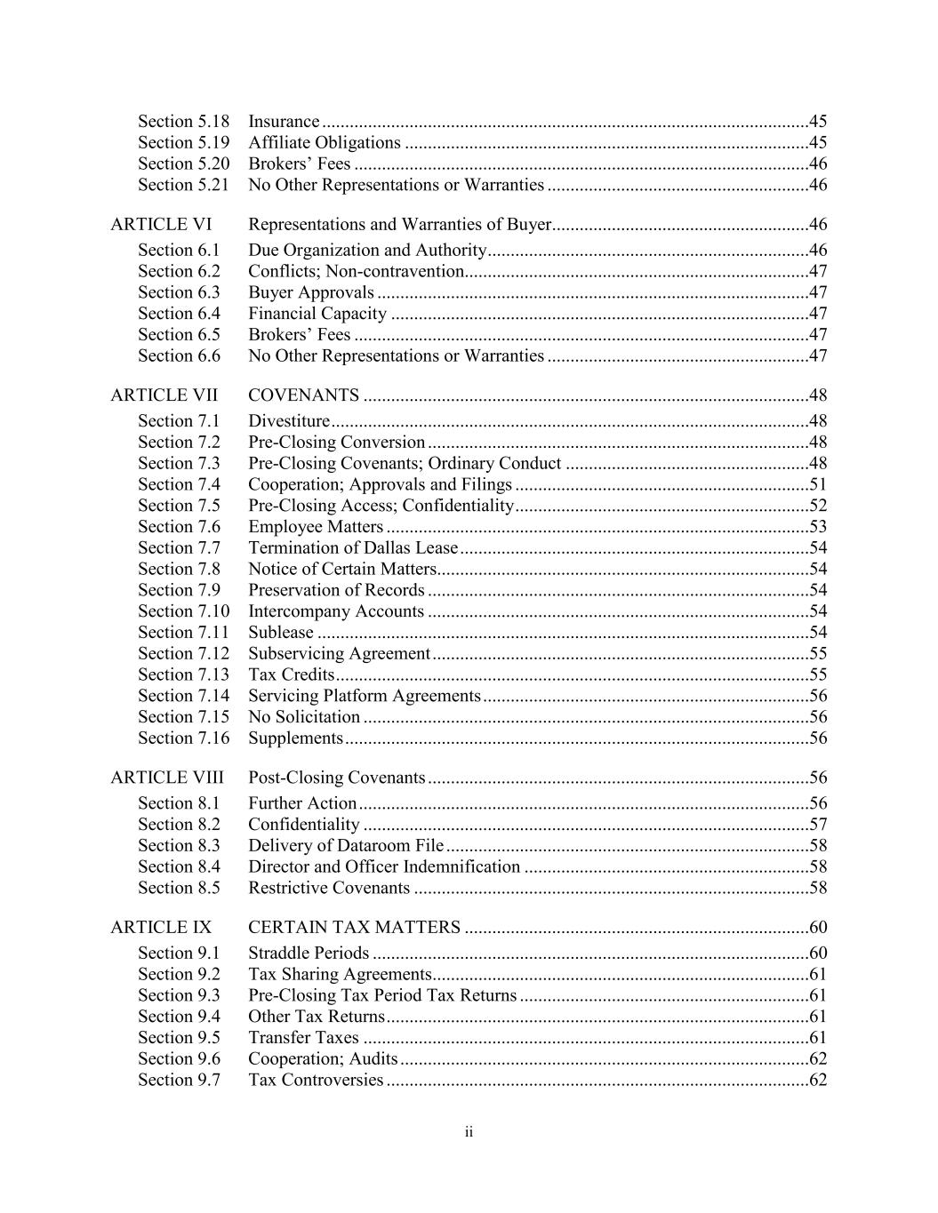 ii Section 5.18 Insurance ..........................................................................................................45 Section 5.19 Affiliate Obligations ........................................................................................45 Section 5.20 Brokers’ Fees ...................................................................................................46 Section 5.21 No Other Representations or Warranties .........................................................46 ARTICLE VI Representations and Warranties of Buyer ........................................................46 Section 6.1 Due Organization and Authority ......................................................................46 Section 6.2 Conflicts; Non-contravention...........................................................................47 Section 6.3 Buyer Approvals ..............................................................................................47 Section 6.4 Financial Capacity ...........................................................................................47 Section 6.5 Brokers’ Fees ...................................................................................................47 Section 6.6 No Other Representations or Warranties .........................................................47 ARTICLE VII COVENANTS .................................................................................................48 Section 7.1 Divestiture ........................................................................................................48 Section 7.2 Pre-Closing Conversion ...................................................................................48 Section 7.3 Pre-Closing Covenants; Ordinary Conduct .....................................................48 Section 7.4 Cooperation; Approvals and Filings ................................................................51 Section 7.5 Pre-Closing Access; Confidentiality ................................................................52 Section 7.6 Employee Matters ............................................................................................53 Section 7.7 Termination of Dallas Lease ............................................................................54 Section 7.8 Notice of Certain Matters.................................................................................54 Section 7.9 Preservation of Records ...................................................................................54 Section 7.10 Intercompany Accounts ...................................................................................54 Section 7.11 Sublease ...........................................................................................................54 Section 7.12 Subservicing Agreement ..................................................................................55 Section 7.13 Tax Credits .......................................................................................................55 Section 7.14 Servicing Platform Agreements .......................................................................56 Section 7.15 No Solicitation .................................................................................................56 Section 7.16 Supplements .....................................................................................................56 ARTICLE VIII Post-Closing Covenants ...................................................................................56 Section 8.1 Further Action ..................................................................................................56 Section 8.2 Confidentiality .................................................................................................57 Section 8.3 Delivery of Dataroom File ...............................................................................58 Section 8.4 Director and Officer Indemnification ..............................................................58 Section 8.5 Restrictive Covenants ......................................................................................58 ARTICLE IX CERTAIN TAX MATTERS ...........................................................................60 Section 9.1 Straddle Periods ...............................................................................................60 Section 9.2 Tax Sharing Agreements..................................................................................61 Section 9.3 Pre-Closing Tax Period Tax Returns ...............................................................61 Section 9.4 Other Tax Returns ............................................................................................61 Section 9.5 Transfer Taxes .................................................................................................61 Section 9.6 Cooperation; Audits .........................................................................................62 Section 9.7 Tax Controversies ............................................................................................62
