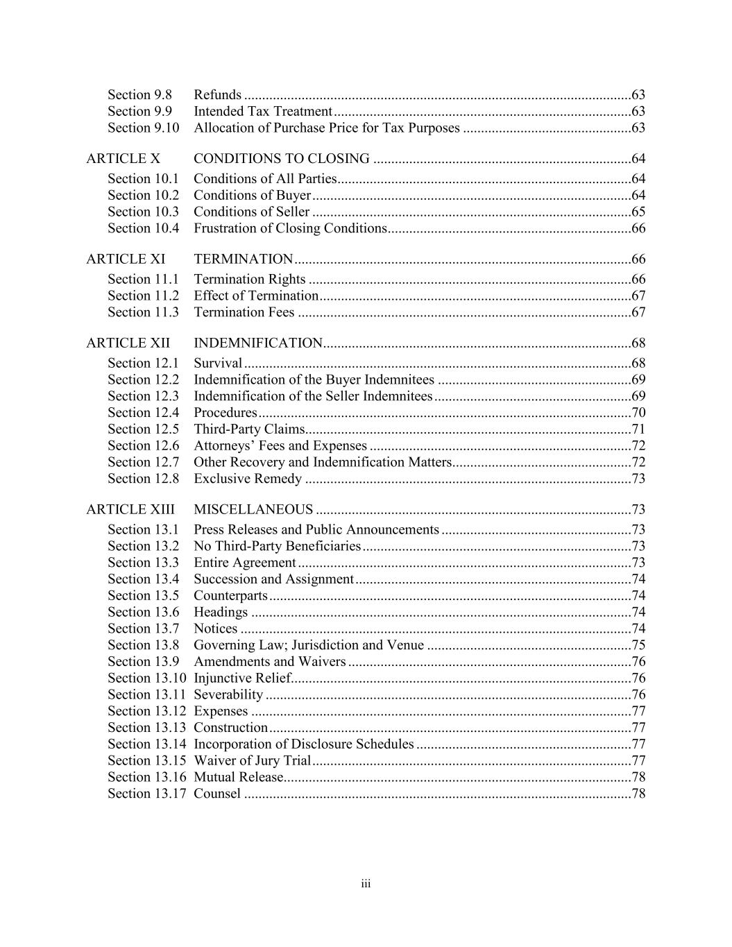 iii Section 9.8 Refunds ............................................................................................................63 Section 9.9 Intended Tax Treatment ...................................................................................63 Section 9.10 Allocation of Purchase Price for Tax Purposes ...............................................63 ARTICLE X CONDITIONS TO CLOSING ........................................................................64 Section 10.1 Conditions of All Parties ..................................................................................64 Section 10.2 Conditions of Buyer .........................................................................................64 Section 10.3 Conditions of Seller .........................................................................................65 Section 10.4 Frustration of Closing Conditions ....................................................................66 ARTICLE XI TERMINATION ..............................................................................................66 Section 11.1 Termination Rights ..........................................................................................66 Section 11.2 Effect of Termination .......................................................................................67 Section 11.3 Termination Fees .............................................................................................67 ARTICLE XII INDEMNIFICATION......................................................................................68 Section 12.1 Survival ............................................................................................................68 Section 12.2 Indemnification of the Buyer Indemnitees ......................................................69 Section 12.3 Indemnification of the Seller Indemnitees .......................................................69 Section 12.4 Procedures ........................................................................................................70 Section 12.5 Third-Party Claims...........................................................................................71 Section 12.6 Attorneys’ Fees and Expenses .........................................................................72 Section 12.7 Other Recovery and Indemnification Matters..................................................72 Section 12.8 Exclusive Remedy ...........................................................................................73 ARTICLE XIII MISCELLANEOUS ........................................................................................73 Section 13.1 Press Releases and Public Announcements .....................................................73 Section 13.2 No Third-Party Beneficiaries ...........................................................................73 Section 13.3 Entire Agreement .............................................................................................73 Section 13.4 Succession and Assignment .............................................................................74 Section 13.5 Counterparts .....................................................................................................74 Section 13.6 Headings ..........................................................................................................74 Section 13.7 Notices .............................................................................................................74 Section 13.8 Governing Law; Jurisdiction and Venue .........................................................75 Section 13.9 Amendments and Waivers ...............................................................................76 Section 13.10 Injunctive Relief...............................................................................................76 Section 13.11 Severability ......................................................................................................76 Section 13.12 Expenses ..........................................................................................................77 Section 13.13 Construction .....................................................................................................77 Section 13.14 Incorporation of Disclosure Schedules ............................................................77 Section 13.15 Waiver of Jury Trial .........................................................................................77 Section 13.16 Mutual Release.................................................................................................78 Section 13.17 Counsel ............................................................................................................78