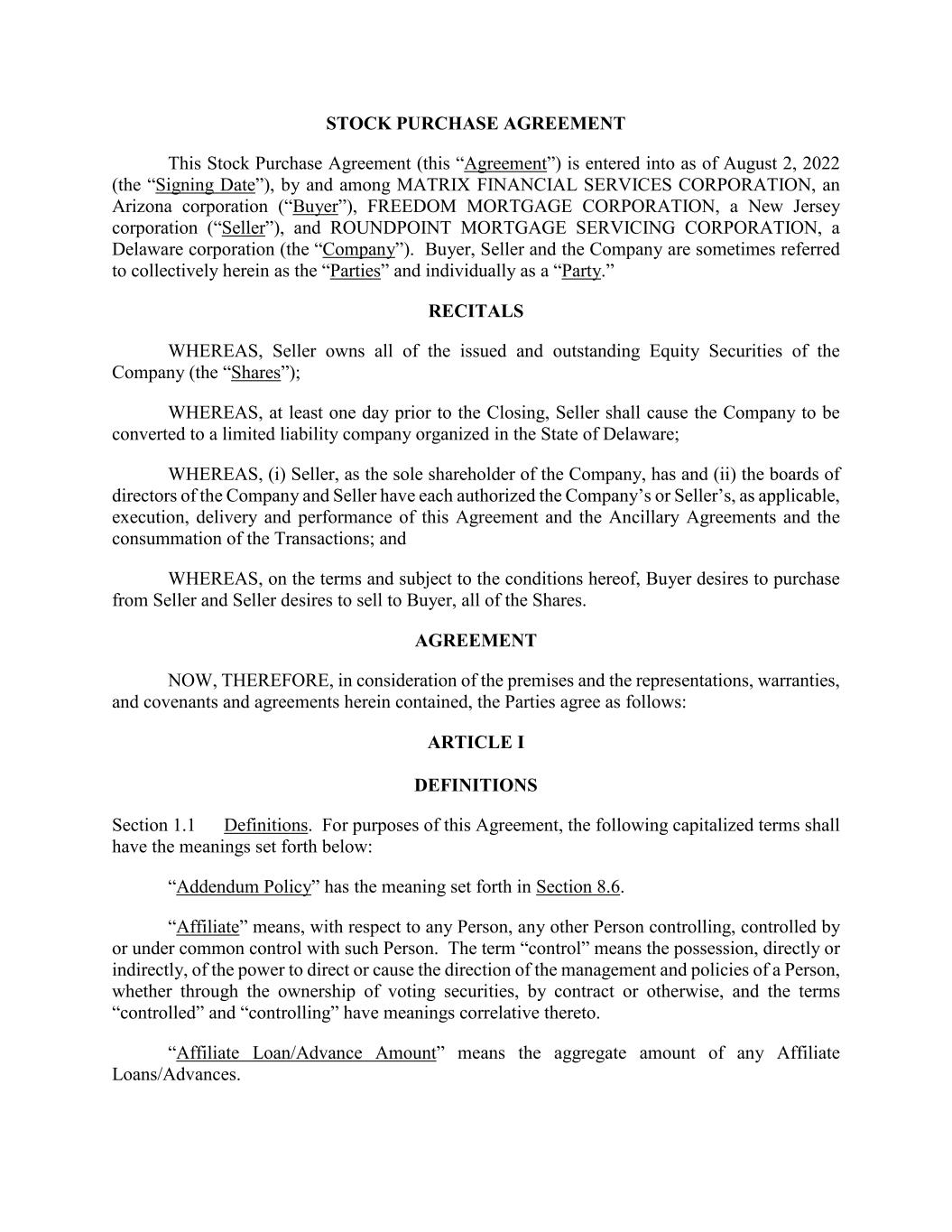 STOCK PURCHASE AGREEMENT This Stock Purchase Agreement (this “Agreement”) is entered into as of August 2, 2022 (the “Signing Date”), by and among MATRIX FINANCIAL SERVICES CORPORATION, an Arizona corporation (“Buyer”), FREEDOM MORTGAGE CORPORATION, a New Jersey corporation (“Seller”), and ROUNDPOINT MORTGAGE SERVICING CORPORATION, a Delaware corporation (the “Company”). Buyer, Seller and the Company are sometimes referred to collectively herein as the “Parties” and individually as a “Party.” RECITALS WHEREAS, Seller owns all of the issued and outstanding Equity Securities of the Company (the “Shares”); WHEREAS, at least one day prior to the Closing, Seller shall cause the Company to be converted to a limited liability company organized in the State of Delaware; WHEREAS, (i) Seller, as the sole shareholder of the Company, has and (ii) the boards of directors of the Company and Seller have each authorized the Company’s or Seller’s, as applicable, execution, delivery and performance of this Agreement and the Ancillary Agreements and the consummation of the Transactions; and WHEREAS, on the terms and subject to the conditions hereof, Buyer desires to purchase from Seller and Seller desires to sell to Buyer, all of the Shares. AGREEMENT NOW, THEREFORE, in consideration of the premises and the representations, warranties, and covenants and agreements herein contained, the Parties agree as follows: ARTICLE I DEFINITIONS Section 1.1 Definitions. For purposes of this Agreement, the following capitalized terms shall have the meanings set forth below: “Addendum Policy” has the meaning set forth in Section 8.6. “Affiliate” means, with respect to any Person, any other Person controlling, controlled by or under common control with such Person. The term “control” means the possession, directly or indirectly, of the power to direct or cause the direction of the management and policies of a Person, whether through the ownership of voting securities, by contract or otherwise, and the terms “controlled” and “controlling” have meanings correlative thereto. “Affiliate Loan/Advance Amount” means the aggregate amount of any Affiliate Loans/Advances.