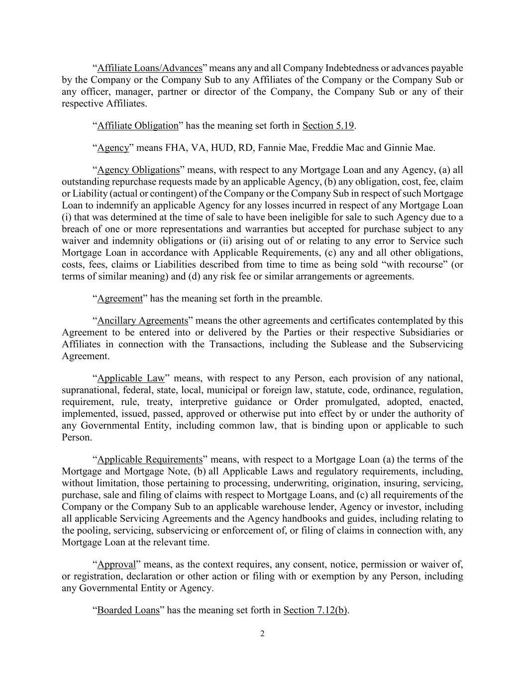 2 “Affiliate Loans/Advances” means any and all Company Indebtedness or advances payable by the Company or the Company Sub to any Affiliates of the Company or the Company Sub or any officer, manager, partner or director of the Company, the Company Sub or any of their respective Affiliates. “Affiliate Obligation” has the meaning set forth in Section 5.19. “Agency” means FHA, VA, HUD, RD, Fannie Mae, Freddie Mac and Ginnie Mae. “Agency Obligations” means, with respect to any Mortgage Loan and any Agency, (a) all outstanding repurchase requests made by an applicable Agency, (b) any obligation, cost, fee, claim or Liability (actual or contingent) of the Company or the Company Sub in respect of such Mortgage Loan to indemnify an applicable Agency for any losses incurred in respect of any Mortgage Loan (i) that was determined at the time of sale to have been ineligible for sale to such Agency due to a breach of one or more representations and warranties but accepted for purchase subject to any waiver and indemnity obligations or (ii) arising out of or relating to any error to Service such Mortgage Loan in accordance with Applicable Requirements, (c) any and all other obligations, costs, fees, claims or Liabilities described from time to time as being sold “with recourse” (or terms of similar meaning) and (d) any risk fee or similar arrangements or agreements. “Agreement” has the meaning set forth in the preamble. “Ancillary Agreements” means the other agreements and certificates contemplated by this Agreement to be entered into or delivered by the Parties or their respective Subsidiaries or Affiliates in connection with the Transactions, including the Sublease and the Subservicing Agreement. “Applicable Law” means, with respect to any Person, each provision of any national, supranational, federal, state, local, municipal or foreign law, statute, code, ordinance, regulation, requirement, rule, treaty, interpretive guidance or Order promulgated, adopted, enacted, implemented, issued, passed, approved or otherwise put into effect by or under the authority of any Governmental Entity, including common law, that is binding upon or applicable to such Person. “Applicable Requirements” means, with respect to a Mortgage Loan (a) the terms of the Mortgage and Mortgage Note, (b) all Applicable Laws and regulatory requirements, including, without limitation, those pertaining to processing, underwriting, origination, insuring, servicing, purchase, sale and filing of claims with respect to Mortgage Loans, and (c) all requirements of the Company or the Company Sub to an applicable warehouse lender, Agency or investor, including all applicable Servicing Agreements and the Agency handbooks and guides, including relating to the pooling, servicing, subservicing or enforcement of, or filing of claims in connection with, any Mortgage Loan at the relevant time. “Approval” means, as the context requires, any consent, notice, permission or waiver of, or registration, declaration or other action or filing with or exemption by any Person, including any Governmental Entity or Agency. “Boarded Loans” has the meaning set forth in Section 7.12(b).