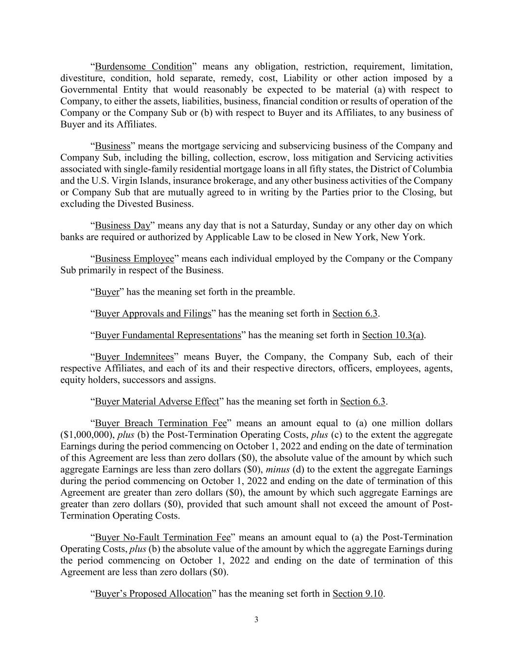3 “Burdensome Condition” means any obligation, restriction, requirement, limitation, divestiture, condition, hold separate, remedy, cost, Liability or other action imposed by a Governmental Entity that would reasonably be expected to be material (a) with respect to Company, to either the assets, liabilities, business, financial condition or results of operation of the Company or the Company Sub or (b) with respect to Buyer and its Affiliates, to any business of Buyer and its Affiliates. “Business” means the mortgage servicing and subservicing business of the Company and Company Sub, including the billing, collection, escrow, loss mitigation and Servicing activities associated with single-family residential mortgage loans in all fifty states, the District of Columbia and the U.S. Virgin Islands, insurance brokerage, and any other business activities of the Company or Company Sub that are mutually agreed to in writing by the Parties prior to the Closing, but excluding the Divested Business. “Business Day” means any day that is not a Saturday, Sunday or any other day on which banks are required or authorized by Applicable Law to be closed in New York, New York. “Business Employee” means each individual employed by the Company or the Company Sub primarily in respect of the Business. “Buyer” has the meaning set forth in the preamble. “Buyer Approvals and Filings” has the meaning set forth in Section 6.3. “Buyer Fundamental Representations” has the meaning set forth in Section 10.3(a). “Buyer Indemnitees” means Buyer, the Company, the Company Sub, each of their respective Affiliates, and each of its and their respective directors, officers, employees, agents, equity holders, successors and assigns. “Buyer Material Adverse Effect” has the meaning set forth in Section 6.3. “Buyer Breach Termination Fee” means an amount equal to (a) one million dollars ($1,000,000), plus (b) the Post-Termination Operating Costs, plus (c) to the extent the aggregate Earnings during the period commencing on October 1, 2022 and ending on the date of termination of this Agreement are less than zero dollars ($0), the absolute value of the amount by which such aggregate Earnings are less than zero dollars ($0), minus (d) to the extent the aggregate Earnings during the period commencing on October 1, 2022 and ending on the date of termination of this Agreement are greater than zero dollars ($0), the amount by which such aggregate Earnings are greater than zero dollars ($0), provided that such amount shall not exceed the amount of Post- Termination Operating Costs. “Buyer No-Fault Termination Fee” means an amount equal to (a) the Post-Termination Operating Costs, plus (b) the absolute value of the amount by which the aggregate Earnings during the period commencing on October 1, 2022 and ending on the date of termination of this Agreement are less than zero dollars ($0). “Buyer’s Proposed Allocation” has the meaning set forth in Section 9.10.