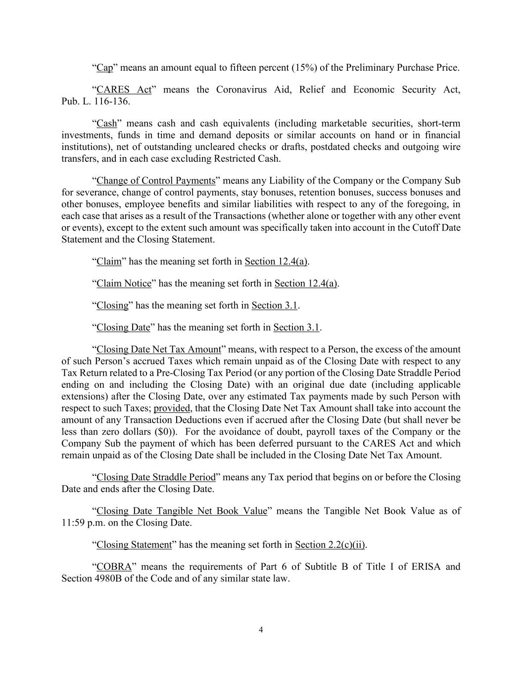 4 “Cap” means an amount equal to fifteen percent (15%) of the Preliminary Purchase Price. “CARES Act” means the Coronavirus Aid, Relief and Economic Security Act, Pub. L. 116-136. “Cash” means cash and cash equivalents (including marketable securities, short-term investments, funds in time and demand deposits or similar accounts on hand or in financial institutions), net of outstanding uncleared checks or drafts, postdated checks and outgoing wire transfers, and in each case excluding Restricted Cash. “Change of Control Payments” means any Liability of the Company or the Company Sub for severance, change of control payments, stay bonuses, retention bonuses, success bonuses and other bonuses, employee benefits and similar liabilities with respect to any of the foregoing, in each case that arises as a result of the Transactions (whether alone or together with any other event or events), except to the extent such amount was specifically taken into account in the Cutoff Date Statement and the Closing Statement. “Claim” has the meaning set forth in Section 12.4(a). “Claim Notice” has the meaning set forth in Section 12.4(a). “Closing” has the meaning set forth in Section 3.1. “Closing Date” has the meaning set forth in Section 3.1. “Closing Date Net Tax Amount” means, with respect to a Person, the excess of the amount of such Person’s accrued Taxes which remain unpaid as of the Closing Date with respect to any Tax Return related to a Pre-Closing Tax Period (or any portion of the Closing Date Straddle Period ending on and including the Closing Date) with an original due date (including applicable extensions) after the Closing Date, over any estimated Tax payments made by such Person with respect to such Taxes; provided, that the Closing Date Net Tax Amount shall take into account the amount of any Transaction Deductions even if accrued after the Closing Date (but shall never be less than zero dollars ($0)). For the avoidance of doubt, payroll taxes of the Company or the Company Sub the payment of which has been deferred pursuant to the CARES Act and which remain unpaid as of the Closing Date shall be included in the Closing Date Net Tax Amount. “Closing Date Straddle Period” means any Tax period that begins on or before the Closing Date and ends after the Closing Date. “Closing Date Tangible Net Book Value” means the Tangible Net Book Value as of 11:59 p.m. on the Closing Date. “Closing Statement” has the meaning set forth in Section 2.2(c)(ii). “COBRA” means the requirements of Part 6 of Subtitle B of Title I of ERISA and Section 4980B of the Code and of any similar state law.