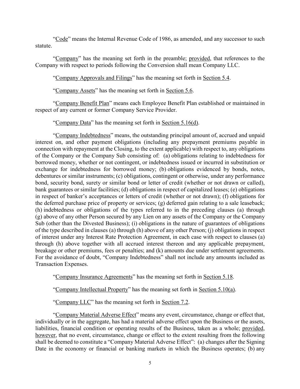 5 “Code” means the Internal Revenue Code of 1986, as amended, and any successor to such statute. “Company” has the meaning set forth in the preamble; provided, that references to the Company with respect to periods following the Conversion shall mean Company LLC. “Company Approvals and Filings” has the meaning set forth in Section 5.4. “Company Assets” has the meaning set forth in Section 5.6. “Company Benefit Plan” means each Employee Benefit Plan established or maintained in respect of any current or former Company Service Provider. “Company Data” has the meaning set forth in Section 5.16(d). “Company Indebtedness” means, the outstanding principal amount of, accrued and unpaid interest on, and other payment obligations (including any prepayment premiums payable in connection with repayment at the Closing, to the extent applicable) with respect to, any obligations of the Company or the Company Sub consisting of: (a) obligations relating to indebtedness for borrowed money, whether or not contingent, or indebtedness issued or incurred in substitution or exchange for indebtedness for borrowed money; (b) obligations evidenced by bonds, notes, debentures or similar instruments; (c) obligations, contingent or otherwise, under any performance bond, security bond, surety or similar bond or letter of credit (whether or not drawn or called), bank guarantees or similar facilities; (d) obligations in respect of capitalized leases; (e) obligations in respect of banker’s acceptances or letters of credit (whether or not drawn); (f) obligations for the deferred purchase price of property or services; (g) deferred gain relating to a sale leaseback; (h) indebtedness or obligations of the types referred to in the preceding clauses (a) through (g) above of any other Person secured by any Lien on any assets of the Company or the Company Sub (other than the Divested Business); (i) obligations in the nature of guarantees of obligations of the type described in clauses (a) through (h) above of any other Person; (j) obligations in respect of interest under any Interest Rate Protection Agreement, in each case with respect to clauses (a) through (h) above together with all accrued interest thereon and any applicable prepayment, breakage or other premiums, fees or penalties; and (k) amounts due under settlement agreements. For the avoidance of doubt, “Company Indebtedness” shall not include any amounts included as Transaction Expenses. “Company Insurance Agreements” has the meaning set forth in Section 5.18. “Company Intellectual Property” has the meaning set forth in Section 5.10(a). “Company LLC” has the meaning set forth in Section 7.2. “Company Material Adverse Effect” means any event, circumstance, change or effect that, individually or in the aggregate, has had a material adverse effect upon the Business or the assets, liabilities, financial condition or operating results of the Business, taken as a whole; provided, however, that no event, circumstance, change or effect to the extent resulting from the following shall be deemed to constitute a “Company Material Adverse Effect”: (a) changes after the Signing Date in the economy or financial or banking markets in which the Business operates; (b) any