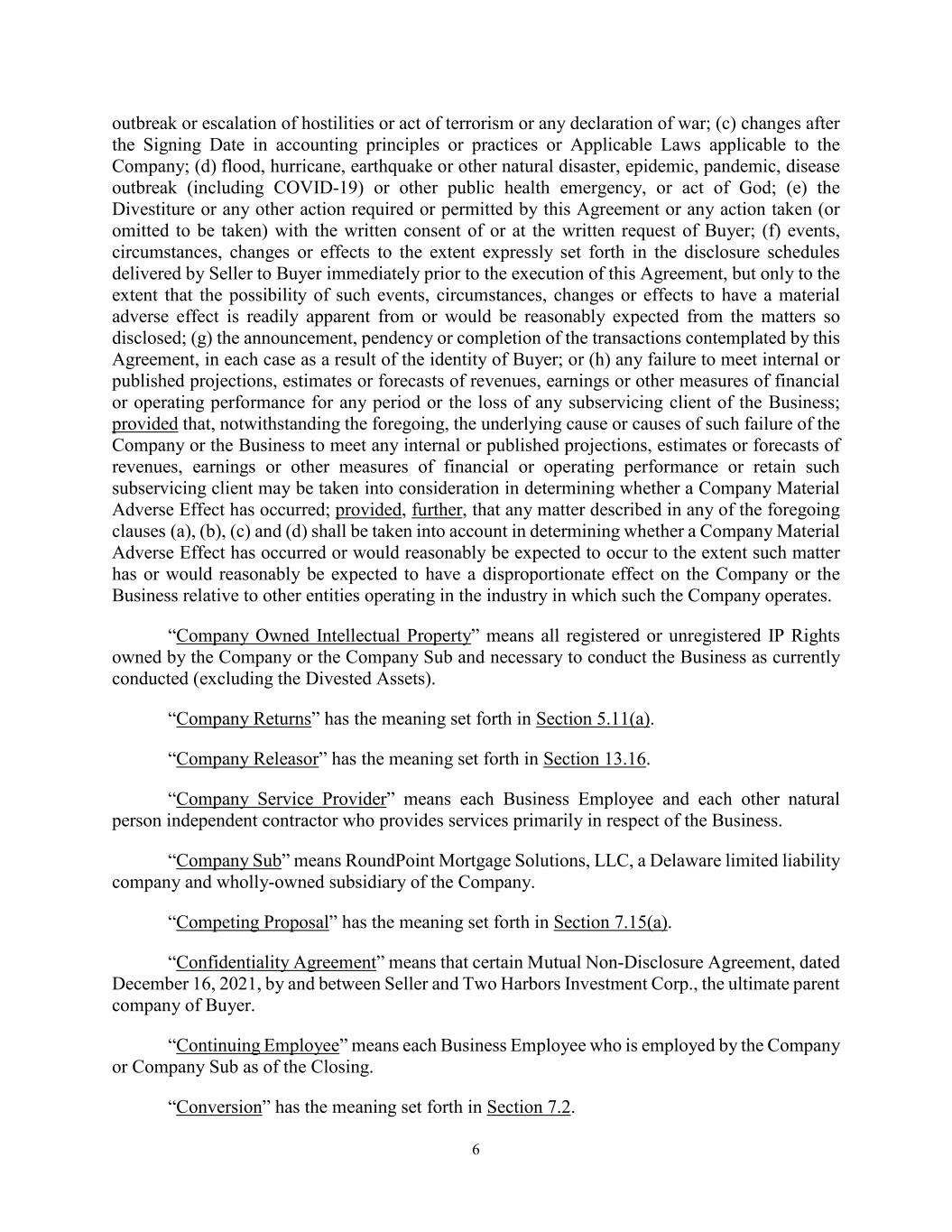 6 outbreak or escalation of hostilities or act of terrorism or any declaration of war; (c) changes after the Signing Date in accounting principles or practices or Applicable Laws applicable to the Company; (d) flood, hurricane, earthquake or other natural disaster, epidemic, pandemic, disease outbreak (including COVID-19) or other public health emergency, or act of God; (e) the Divestiture or any other action required or permitted by this Agreement or any action taken (or omitted to be taken) with the written consent of or at the written request of Buyer; (f) events, circumstances, changes or effects to the extent expressly set forth in the disclosure schedules delivered by Seller to Buyer immediately prior to the execution of this Agreement, but only to the extent that the possibility of such events, circumstances, changes or effects to have a material adverse effect is readily apparent from or would be reasonably expected from the matters so disclosed; (g) the announcement, pendency or completion of the transactions contemplated by this Agreement, in each case as a result of the identity of Buyer; or (h) any failure to meet internal or published projections, estimates or forecasts of revenues, earnings or other measures of financial or operating performance for any period or the loss of any subservicing client of the Business; provided that, notwithstanding the foregoing, the underlying cause or causes of such failure of the Company or the Business to meet any internal or published projections, estimates or forecasts of revenues, earnings or other measures of financial or operating performance or retain such subservicing client may be taken into consideration in determining whether a Company Material Adverse Effect has occurred; provided, further, that any matter described in any of the foregoing clauses (a), (b), (c) and (d) shall be taken into account in determining whether a Company Material Adverse Effect has occurred or would reasonably be expected to occur to the extent such matter has or would reasonably be expected to have a disproportionate effect on the Company or the Business relative to other entities operating in the industry in which such the Company operates. “Company Owned Intellectual Property” means all registered or unregistered IP Rights owned by the Company or the Company Sub and necessary to conduct the Business as currently conducted (excluding the Divested Assets). “Company Returns” has the meaning set forth in Section 5.11(a). “Company Releasor” has the meaning set forth in Section 13.16. “Company Service Provider” means each Business Employee and each other natural person independent contractor who provides services primarily in respect of the Business. “Company Sub” means RoundPoint Mortgage Solutions, LLC, a Delaware limited liability company and wholly-owned subsidiary of the Company. “Competing Proposal” has the meaning set forth in Section 7.15(a). “Confidentiality Agreement” means that certain Mutual Non-Disclosure Agreement, dated December 16, 2021, by and between Seller and Two Harbors Investment Corp., the ultimate parent company of Buyer. “Continuing Employee” means each Business Employee who is employed by the Company or Company Sub as of the Closing. “Conversion” has the meaning set forth in Section 7.2.