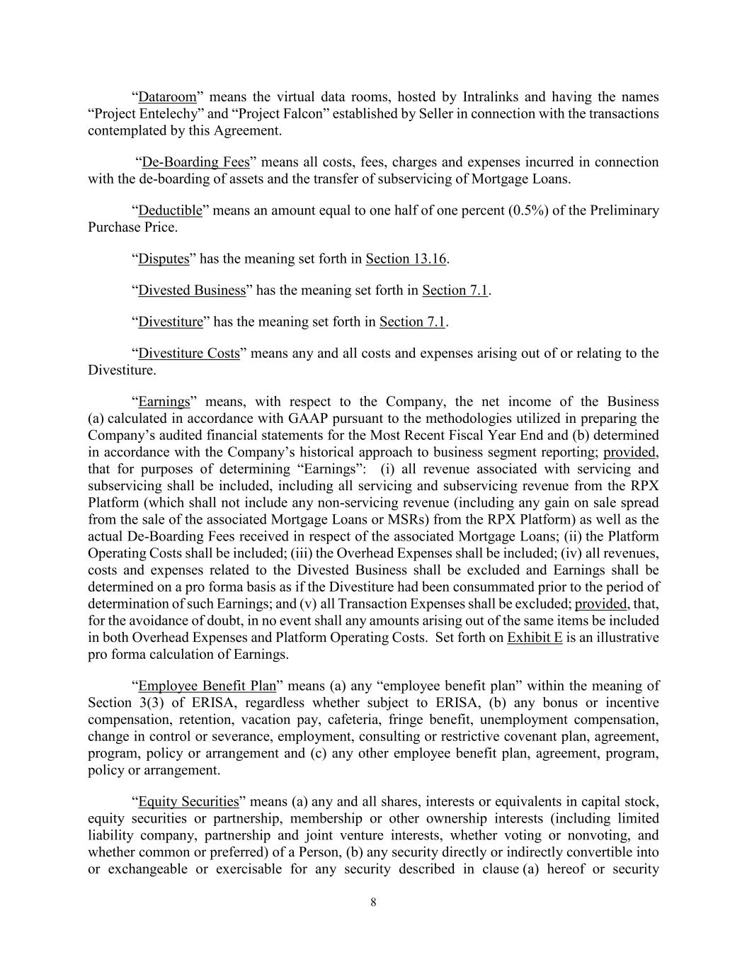 8 “Dataroom” means the virtual data rooms, hosted by Intralinks and having the names “Project Entelechy” and “Project Falcon” established by Seller in connection with the transactions contemplated by this Agreement. “De-Boarding Fees” means all costs, fees, charges and expenses incurred in connection with the de-boarding of assets and the transfer of subservicing of Mortgage Loans. “Deductible” means an amount equal to one half of one percent (0.5%) of the Preliminary Purchase Price. “Disputes” has the meaning set forth in Section 13.16. “Divested Business” has the meaning set forth in Section 7.1. “Divestiture” has the meaning set forth in Section 7.1. “Divestiture Costs” means any and all costs and expenses arising out of or relating to the Divestiture. “Earnings” means, with respect to the Company, the net income of the Business (a) calculated in accordance with GAAP pursuant to the methodologies utilized in preparing the Company’s audited financial statements for the Most Recent Fiscal Year End and (b) determined in accordance with the Company’s historical approach to business segment reporting; provided, that for purposes of determining “Earnings”: (i) all revenue associated with servicing and subservicing shall be included, including all servicing and subservicing revenue from the RPX Platform (which shall not include any non-servicing revenue (including any gain on sale spread from the sale of the associated Mortgage Loans or MSRs) from the RPX Platform) as well as the actual De-Boarding Fees received in respect of the associated Mortgage Loans; (ii) the Platform Operating Costs shall be included; (iii) the Overhead Expenses shall be included; (iv) all revenues, costs and expenses related to the Divested Business shall be excluded and Earnings shall be determined on a pro forma basis as if the Divestiture had been consummated prior to the period of determination of such Earnings; and (v) all Transaction Expenses shall be excluded; provided, that, for the avoidance of doubt, in no event shall any amounts arising out of the same items be included in both Overhead Expenses and Platform Operating Costs. Set forth on Exhibit E is an illustrative pro forma calculation of Earnings. “Employee Benefit Plan” means (a) any “employee benefit plan” within the meaning of Section 3(3) of ERISA, regardless whether subject to ERISA, (b) any bonus or incentive compensation, retention, vacation pay, cafeteria, fringe benefit, unemployment compensation, change in control or severance, employment, consulting or restrictive covenant plan, agreement, program, policy or arrangement and (c) any other employee benefit plan, agreement, program, policy or arrangement. “Equity Securities” means (a) any and all shares, interests or equivalents in capital stock, equity securities or partnership, membership or other ownership interests (including limited liability company, partnership and joint venture interests, whether voting or nonvoting, and whether common or preferred) of a Person, (b) any security directly or indirectly convertible into or exchangeable or exercisable for any security described in clause (a) hereof or security