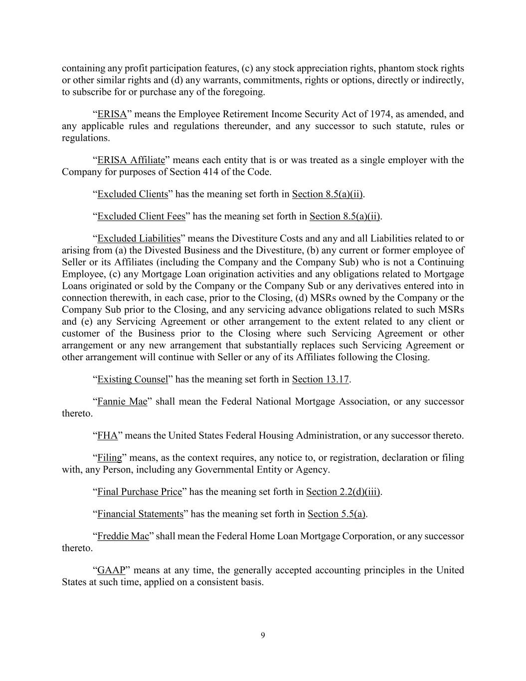 9 containing any profit participation features, (c) any stock appreciation rights, phantom stock rights or other similar rights and (d) any warrants, commitments, rights or options, directly or indirectly, to subscribe for or purchase any of the foregoing. “ERISA” means the Employee Retirement Income Security Act of 1974, as amended, and any applicable rules and regulations thereunder, and any successor to such statute, rules or regulations. “ERISA Affiliate” means each entity that is or was treated as a single employer with the Company for purposes of Section 414 of the Code. “Excluded Clients” has the meaning set forth in Section 8.5(a)(ii). “Excluded Client Fees” has the meaning set forth in Section 8.5(a)(ii). “Excluded Liabilities” means the Divestiture Costs and any and all Liabilities related to or arising from (a) the Divested Business and the Divestiture, (b) any current or former employee of Seller or its Affiliates (including the Company and the Company Sub) who is not a Continuing Employee, (c) any Mortgage Loan origination activities and any obligations related to Mortgage Loans originated or sold by the Company or the Company Sub or any derivatives entered into in connection therewith, in each case, prior to the Closing, (d) MSRs owned by the Company or the Company Sub prior to the Closing, and any servicing advance obligations related to such MSRs and (e) any Servicing Agreement or other arrangement to the extent related to any client or customer of the Business prior to the Closing where such Servicing Agreement or other arrangement or any new arrangement that substantially replaces such Servicing Agreement or other arrangement will continue with Seller or any of its Affiliates following the Closing. “Existing Counsel” has the meaning set forth in Section 13.17. “Fannie Mae” shall mean the Federal National Mortgage Association, or any successor thereto. “FHA” means the United States Federal Housing Administration, or any successor thereto. “Filing” means, as the context requires, any notice to, or registration, declaration or filing with, any Person, including any Governmental Entity or Agency. “Final Purchase Price” has the meaning set forth in Section 2.2(d)(iii). “Financial Statements” has the meaning set forth in Section 5.5(a). “Freddie Mac” shall mean the Federal Home Loan Mortgage Corporation, or any successor thereto. “GAAP” means at any time, the generally accepted accounting principles in the United States at such time, applied on a consistent basis.