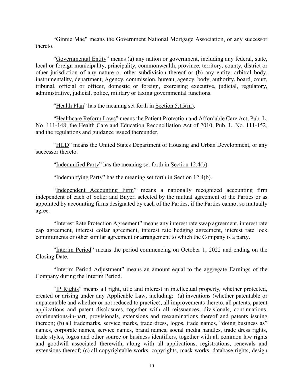 10 “Ginnie Mae” means the Government National Mortgage Association, or any successor thereto. “Governmental Entity” means (a) any nation or government, including any federal, state, local or foreign municipality, principality, commonwealth, province, territory, county, district or other jurisdiction of any nature or other subdivision thereof or (b) any entity, arbitral body, instrumentality, department, Agency, commission, bureau, agency, body, authority, board, court, tribunal, official or officer, domestic or foreign, exercising executive, judicial, regulatory, administrative, judicial, police, military or taxing governmental functions. “Health Plan” has the meaning set forth in Section 5.15(m). “Healthcare Reform Laws” means the Patient Protection and Affordable Care Act, Pub. L. No. 111-148, the Health Care and Education Reconciliation Act of 2010, Pub. L. No. 111-152, and the regulations and guidance issued thereunder. “HUD” means the United States Department of Housing and Urban Development, or any successor thereto. “Indemnified Party” has the meaning set forth in Section 12.4(b). “Indemnifying Party” has the meaning set forth in Section 12.4(b). “Independent Accounting Firm” means a nationally recognized accounting firm independent of each of Seller and Buyer, selected by the mutual agreement of the Parties or as appointed by accounting firms designated by each of the Parties, if the Parties cannot so mutually agree. “Interest Rate Protection Agreement” means any interest rate swap agreement, interest rate cap agreement, interest collar agreement, interest rate hedging agreement, interest rate lock commitments or other similar agreement or arrangement to which the Company is a party. “Interim Period” means the period commencing on October 1, 2022 and ending on the Closing Date. “Interim Period Adjustment” means an amount equal to the aggregate Earnings of the Company during the Interim Period. “IP Rights” means all right, title and interest in intellectual property, whether protected, created or arising under any Applicable Law, including: (a) inventions (whether patentable or unpatentable and whether or not reduced to practice), all improvements thereto, all patents, patent applications and patent disclosures, together with all reissuances, divisionals, continuations, continuations-in-part, provisionals, extensions and reexaminations thereof and patents issuing thereon; (b) all trademarks, service marks, trade dress, logos, trade names, “doing business as” names, corporate names, service names, brand names, social media handles, trade dress rights, trade styles, logos and other source or business identifiers, together with all common law rights and goodwill associated therewith, along with all applications, registrations, renewals and extensions thereof; (c) all copyrightable works, copyrights, mask works, database rights, design