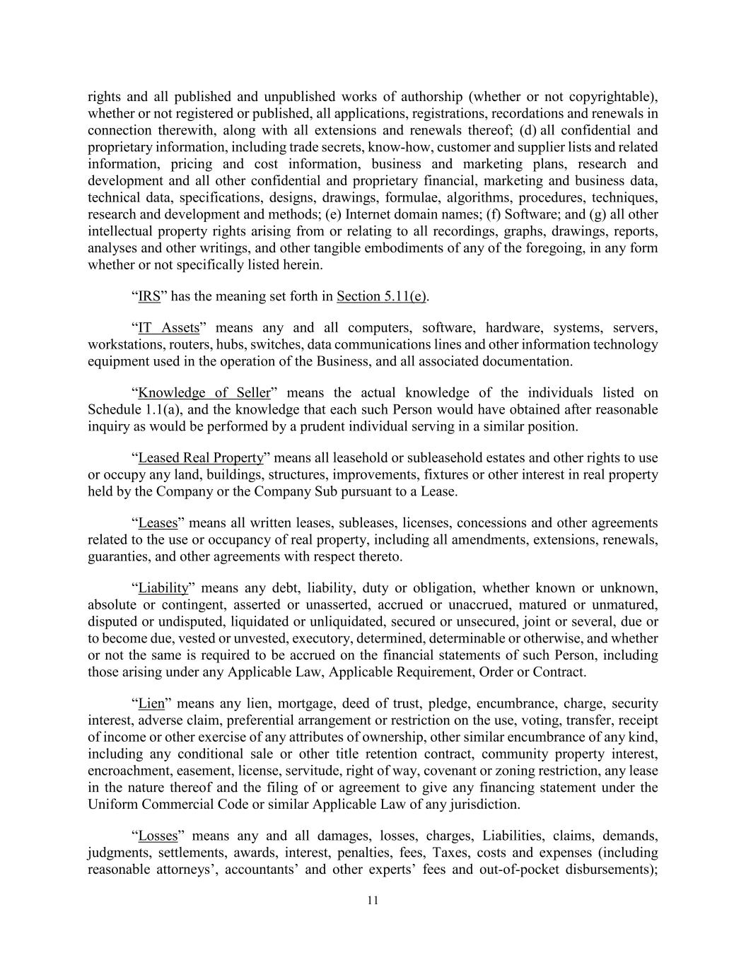11 rights and all published and unpublished works of authorship (whether or not copyrightable), whether or not registered or published, all applications, registrations, recordations and renewals in connection therewith, along with all extensions and renewals thereof; (d) all confidential and proprietary information, including trade secrets, know-how, customer and supplier lists and related information, pricing and cost information, business and marketing plans, research and development and all other confidential and proprietary financial, marketing and business data, technical data, specifications, designs, drawings, formulae, algorithms, procedures, techniques, research and development and methods; (e) Internet domain names; (f) Software; and (g) all other intellectual property rights arising from or relating to all recordings, graphs, drawings, reports, analyses and other writings, and other tangible embodiments of any of the foregoing, in any form whether or not specifically listed herein. “IRS” has the meaning set forth in Section 5.11(e). “IT Assets” means any and all computers, software, hardware, systems, servers, workstations, routers, hubs, switches, data communications lines and other information technology equipment used in the operation of the Business, and all associated documentation. “Knowledge of Seller” means the actual knowledge of the individuals listed on Schedule 1.1(a), and the knowledge that each such Person would have obtained after reasonable inquiry as would be performed by a prudent individual serving in a similar position. “Leased Real Property” means all leasehold or subleasehold estates and other rights to use or occupy any land, buildings, structures, improvements, fixtures or other interest in real property held by the Company or the Company Sub pursuant to a Lease. “Leases” means all written leases, subleases, licenses, concessions and other agreements related to the use or occupancy of real property, including all amendments, extensions, renewals, guaranties, and other agreements with respect thereto. “Liability” means any debt, liability, duty or obligation, whether known or unknown, absolute or contingent, asserted or unasserted, accrued or unaccrued, matured or unmatured, disputed or undisputed, liquidated or unliquidated, secured or unsecured, joint or several, due or to become due, vested or unvested, executory, determined, determinable or otherwise, and whether or not the same is required to be accrued on the financial statements of such Person, including those arising under any Applicable Law, Applicable Requirement, Order or Contract. “Lien” means any lien, mortgage, deed of trust, pledge, encumbrance, charge, security interest, adverse claim, preferential arrangement or restriction on the use, voting, transfer, receipt of income or other exercise of any attributes of ownership, other similar encumbrance of any kind, including any conditional sale or other title retention contract, community property interest, encroachment, easement, license, servitude, right of way, covenant or zoning restriction, any lease in the nature thereof and the filing of or agreement to give any financing statement under the Uniform Commercial Code or similar Applicable Law of any jurisdiction. “Losses” means any and all damages, losses, charges, Liabilities, claims, demands, judgments, settlements, awards, interest, penalties, fees, Taxes, costs and expenses (including reasonable attorneys’, accountants’ and other experts’ fees and out-of-pocket disbursements);