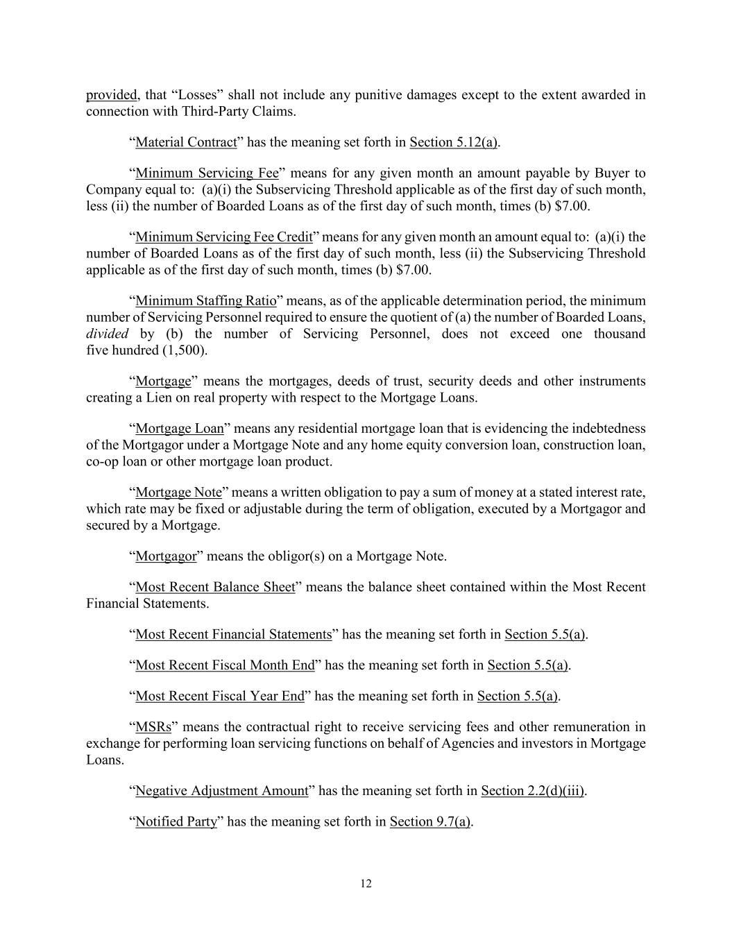 12 provided, that “Losses” shall not include any punitive damages except to the extent awarded in connection with Third-Party Claims. “Material Contract” has the meaning set forth in Section 5.12(a). “Minimum Servicing Fee” means for any given month an amount payable by Buyer to Company equal to: (a)(i) the Subservicing Threshold applicable as of the first day of such month, less (ii) the number of Boarded Loans as of the first day of such month, times (b) $7.00. “Minimum Servicing Fee Credit” means for any given month an amount equal to: (a)(i) the number of Boarded Loans as of the first day of such month, less (ii) the Subservicing Threshold applicable as of the first day of such month, times (b) $7.00. “Minimum Staffing Ratio” means, as of the applicable determination period, the minimum number of Servicing Personnel required to ensure the quotient of (a) the number of Boarded Loans, divided by (b) the number of Servicing Personnel, does not exceed one thousand five hundred (1,500). “Mortgage” means the mortgages, deeds of trust, security deeds and other instruments creating a Lien on real property with respect to the Mortgage Loans. “Mortgage Loan” means any residential mortgage loan that is evidencing the indebtedness of the Mortgagor under a Mortgage Note and any home equity conversion loan, construction loan, co-op loan or other mortgage loan product. “Mortgage Note” means a written obligation to pay a sum of money at a stated interest rate, which rate may be fixed or adjustable during the term of obligation, executed by a Mortgagor and secured by a Mortgage. “Mortgagor” means the obligor(s) on a Mortgage Note. “Most Recent Balance Sheet” means the balance sheet contained within the Most Recent Financial Statements. “Most Recent Financial Statements” has the meaning set forth in Section 5.5(a). “Most Recent Fiscal Month End” has the meaning set forth in Section 5.5(a). “Most Recent Fiscal Year End” has the meaning set forth in Section 5.5(a). “MSRs” means the contractual right to receive servicing fees and other remuneration in exchange for performing loan servicing functions on behalf of Agencies and investors in Mortgage Loans. “Negative Adjustment Amount” has the meaning set forth in Section 2.2(d)(iii). “Notified Party” has the meaning set forth in Section 9.7(a).