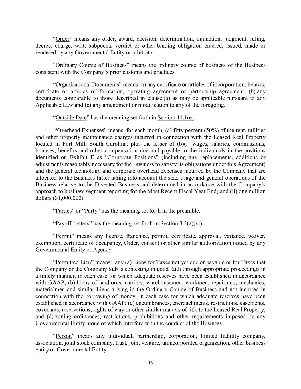 13 “Order” means any order, award, decision, determination, injunction, judgment, ruling, decree, charge, writ, subpoena, verdict or other binding obligation entered, issued, made or rendered by any Governmental Entity or arbitrator. “Ordinary Course of Business” means the ordinary course of business of the Business consistent with the Company’s prior customs and practices. “Organizational Documents” means (a) any certificate or articles of incorporation, bylaws, certificate or articles of formation, operating agreement or partnership agreement, (b) any documents comparable to those described in clause (a) as may be applicable pursuant to any Applicable Law and (c) any amendment or modification to any of the foregoing. “Outside Date” has the meaning set forth in Section 11.1(e). “Overhead Expenses” means, for each month, (a) fifty percent (50%) of the rent, utilities and other property maintenance charges incurred in connection with the Leased Real Property located in Fort Mill, South Carolina, plus the lesser of (b)(i) wages, salaries, commissions, bonuses, benefits and other compensation due and payable to the individuals in the positions identified on Exhibit E as “Corporate Positions” (including any replacements, additions or adjustments reasonably necessary for the Business to satisfy its obligations under this Agreement) and the general technology and corporate overhead expenses incurred by the Company that are allocated to the Business (after taking into account the size, usage and general operations of the Business relative to the Divested Business and determined in accordance with the Company’s approach to business segment reporting for the Most Recent Fiscal Year End) and (ii) one million dollars ($1,000,000). “Parties” or “Party” has the meaning set forth in the preamble. “Payoff Letters” has the meaning set forth in Section 3.3(a)(xi). “Permit” means any license, franchise, permit, certificate, approval, variance, waiver, exemption, certificate of occupancy, Order, consent or other similar authorization issued by any Governmental Entity or Agency. “Permitted Lien” means: any (a) Liens for Taxes not yet due or payable or for Taxes that the Company or the Company Sub is contesting in good faith through appropriate proceedings in a timely manner, in each case for which adequate reserves have been established in accordance with GAAP; (b) Liens of landlords, carriers, warehousemen, workmen, repairmen, mechanics, materialmen and similar Liens arising in the Ordinary Course of Business and not incurred in connection with the borrowing of money, in each case for which adequate reserves have been established in accordance with GAAP; (c) encumbrances, encroachments, restrictions, easements, covenants, reservations, rights of way or other similar matters of title to the Leased Real Property; and (d) zoning ordinances, restrictions, prohibitions and other requirements imposed by any Governmental Entity, none of which interfere with the conduct of the Business. “Person” means any individual, partnership, corporation, limited liability company, association, joint stock company, trust, joint venture, unincorporated organization, other business entity or Governmental Entity.