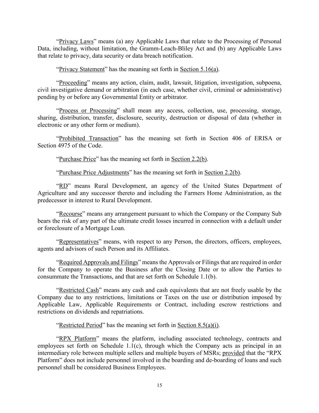 15 “Privacy Laws” means (a) any Applicable Laws that relate to the Processing of Personal Data, including, without limitation, the Gramm-Leach-Bliley Act and (b) any Applicable Laws that relate to privacy, data security or data breach notification. “Privacy Statement” has the meaning set forth in Section 5.16(a). “Proceeding” means any action, claim, audit, lawsuit, litigation, investigation, subpoena, civil investigative demand or arbitration (in each case, whether civil, criminal or administrative) pending by or before any Governmental Entity or arbitrator. “Process or Processing” shall mean any access, collection, use, processing, storage, sharing, distribution, transfer, disclosure, security, destruction or disposal of data (whether in electronic or any other form or medium). “Prohibited Transaction” has the meaning set forth in Section 406 of ERISA or Section 4975 of the Code. “Purchase Price” has the meaning set forth in Section 2.2(b). “Purchase Price Adjustments” has the meaning set forth in Section 2.2(b). “RD” means Rural Development, an agency of the United States Department of Agriculture and any successor thereto and including the Farmers Home Administration, as the predecessor in interest to Rural Development. “Recourse” means any arrangement pursuant to which the Company or the Company Sub bears the risk of any part of the ultimate credit losses incurred in connection with a default under or foreclosure of a Mortgage Loan. “Representatives” means, with respect to any Person, the directors, officers, employees, agents and advisors of such Person and its Affiliates. “Required Approvals and Filings” means the Approvals or Filings that are required in order for the Company to operate the Business after the Closing Date or to allow the Parties to consummate the Transactions, and that are set forth on Schedule 1.1(b). “Restricted Cash” means any cash and cash equivalents that are not freely usable by the Company due to any restrictions, limitations or Taxes on the use or distribution imposed by Applicable Law, Applicable Requirements or Contract, including escrow restrictions and restrictions on dividends and repatriations. “Restricted Period” has the meaning set forth in Section 8.5(a)(i). “RPX Platform” means the platform, including associated technology, contracts and employees set forth on Schedule 1.1(c), through which the Company acts as principal in an intermediary role between multiple sellers and multiple buyers of MSRs; provided that the “RPX Platform” does not include personnel involved in the boarding and de-boarding of loans and such personnel shall be considered Business Employees.