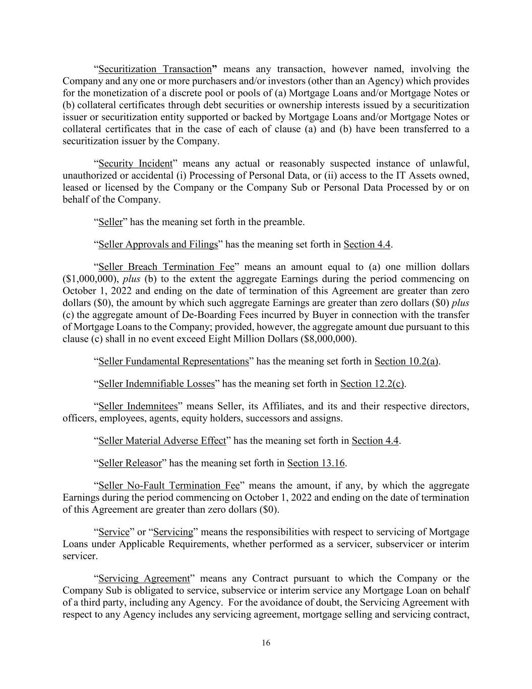 16 “Securitization Transaction” means any transaction, however named, involving the Company and any one or more purchasers and/or investors (other than an Agency) which provides for the monetization of a discrete pool or pools of (a) Mortgage Loans and/or Mortgage Notes or (b) collateral certificates through debt securities or ownership interests issued by a securitization issuer or securitization entity supported or backed by Mortgage Loans and/or Mortgage Notes or collateral certificates that in the case of each of clause (a) and (b) have been transferred to a securitization issuer by the Company. “Security Incident” means any actual or reasonably suspected instance of unlawful, unauthorized or accidental (i) Processing of Personal Data, or (ii) access to the IT Assets owned, leased or licensed by the Company or the Company Sub or Personal Data Processed by or on behalf of the Company. “Seller” has the meaning set forth in the preamble. “Seller Approvals and Filings” has the meaning set forth in Section 4.4. “Seller Breach Termination Fee” means an amount equal to (a) one million dollars ($1,000,000), plus (b) to the extent the aggregate Earnings during the period commencing on October 1, 2022 and ending on the date of termination of this Agreement are greater than zero dollars ($0), the amount by which such aggregate Earnings are greater than zero dollars ($0) plus (c) the aggregate amount of De-Boarding Fees incurred by Buyer in connection with the transfer of Mortgage Loans to the Company; provided, however, the aggregate amount due pursuant to this clause (c) shall in no event exceed Eight Million Dollars ($8,000,000). “Seller Fundamental Representations” has the meaning set forth in Section 10.2(a). “Seller Indemnifiable Losses” has the meaning set forth in Section 12.2(c). “Seller Indemnitees” means Seller, its Affiliates, and its and their respective directors, officers, employees, agents, equity holders, successors and assigns. “Seller Material Adverse Effect” has the meaning set forth in Section 4.4. “Seller Releasor” has the meaning set forth in Section 13.16. “Seller No-Fault Termination Fee” means the amount, if any, by which the aggregate Earnings during the period commencing on October 1, 2022 and ending on the date of termination of this Agreement are greater than zero dollars ($0). “Service” or “Servicing” means the responsibilities with respect to servicing of Mortgage Loans under Applicable Requirements, whether performed as a servicer, subservicer or interim servicer. “Servicing Agreement” means any Contract pursuant to which the Company or the Company Sub is obligated to service, subservice or interim service any Mortgage Loan on behalf of a third party, including any Agency. For the avoidance of doubt, the Servicing Agreement with respect to any Agency includes any servicing agreement, mortgage selling and servicing contract,